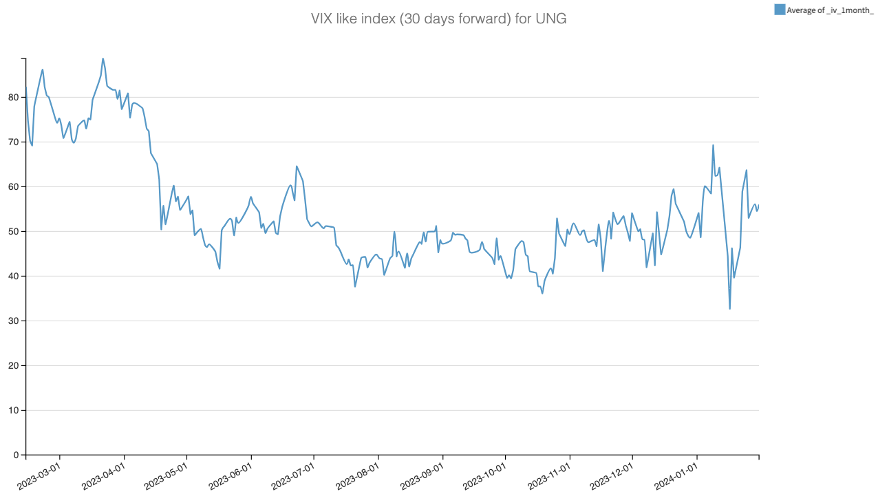 Our focus isn't on predicting the future movements of UNG's price. Rather, we anticipate that option sellers will maintain elevated quotes as a precaution against potential drops in temperature or geopolitical shocks that could affect natural gas prices.