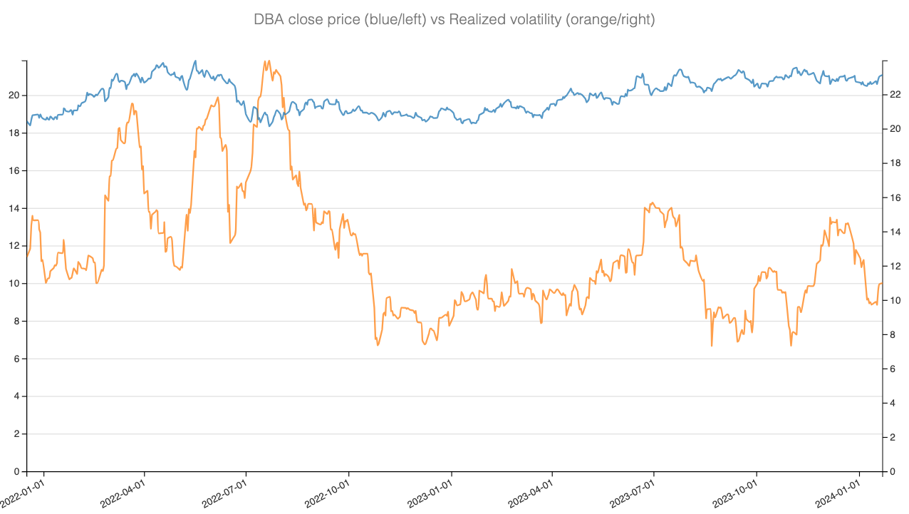 A glance at DBA's recent price trajectory reveals a relatively stable range between $18 and $22. Despite some spikes in 2022, the overall realized volatility has remained subdued, particularly in January, following a high at the end of last year.