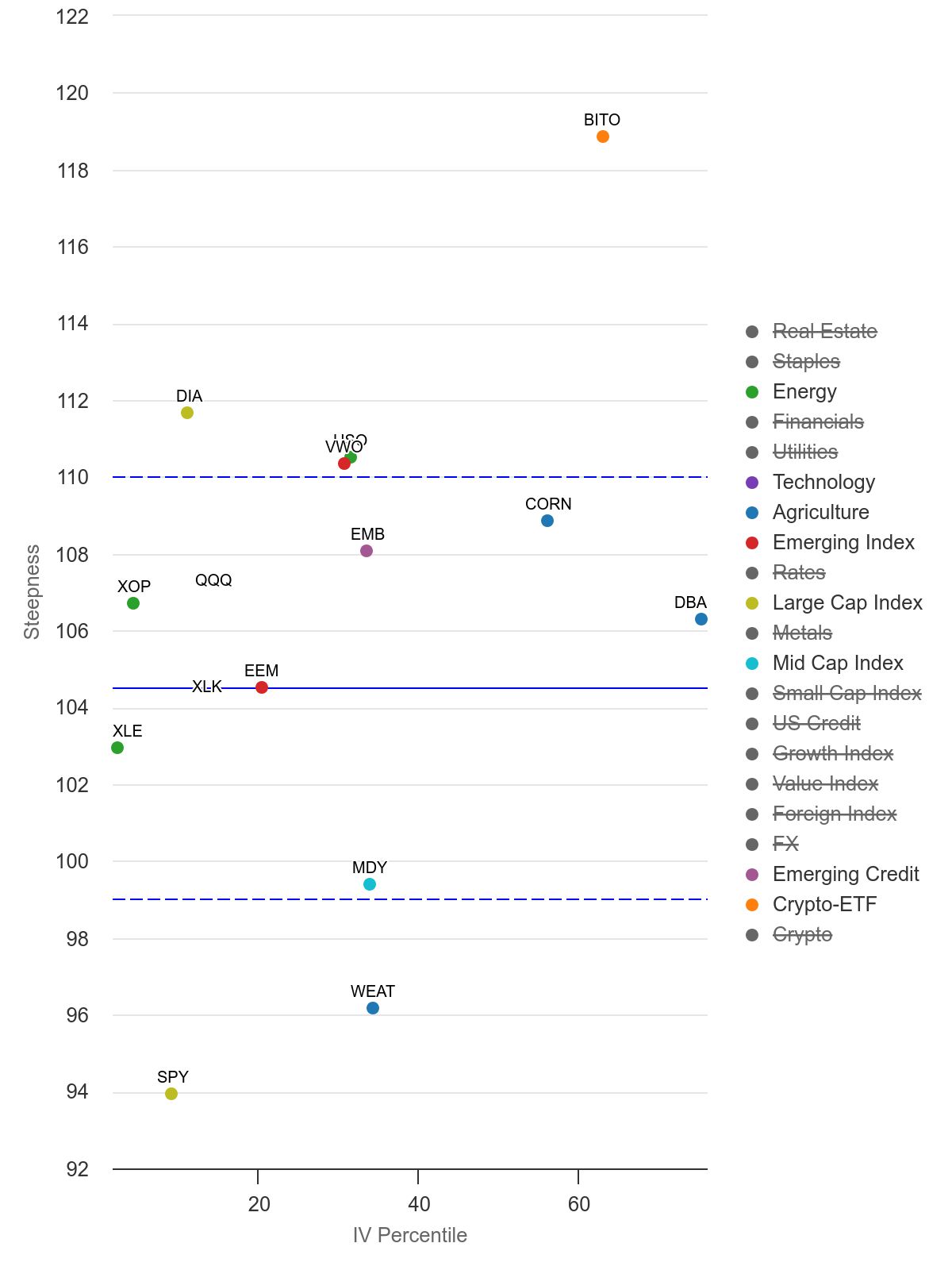 This pattern suggests that while the fund's price movements are fairly stable, the volatility inherent in the agricultural sector might lead option sellers to maintain higher quotes. This discrepancy could open up attractive opportunities for us.