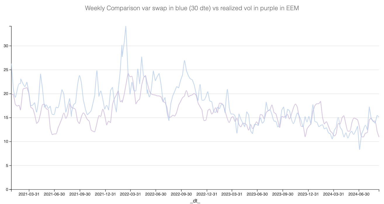 Let’s start by examining the variance risk premium (VRP) in EEM by comparing the implied volatility at 30 days to the realized volatility we just discussed.