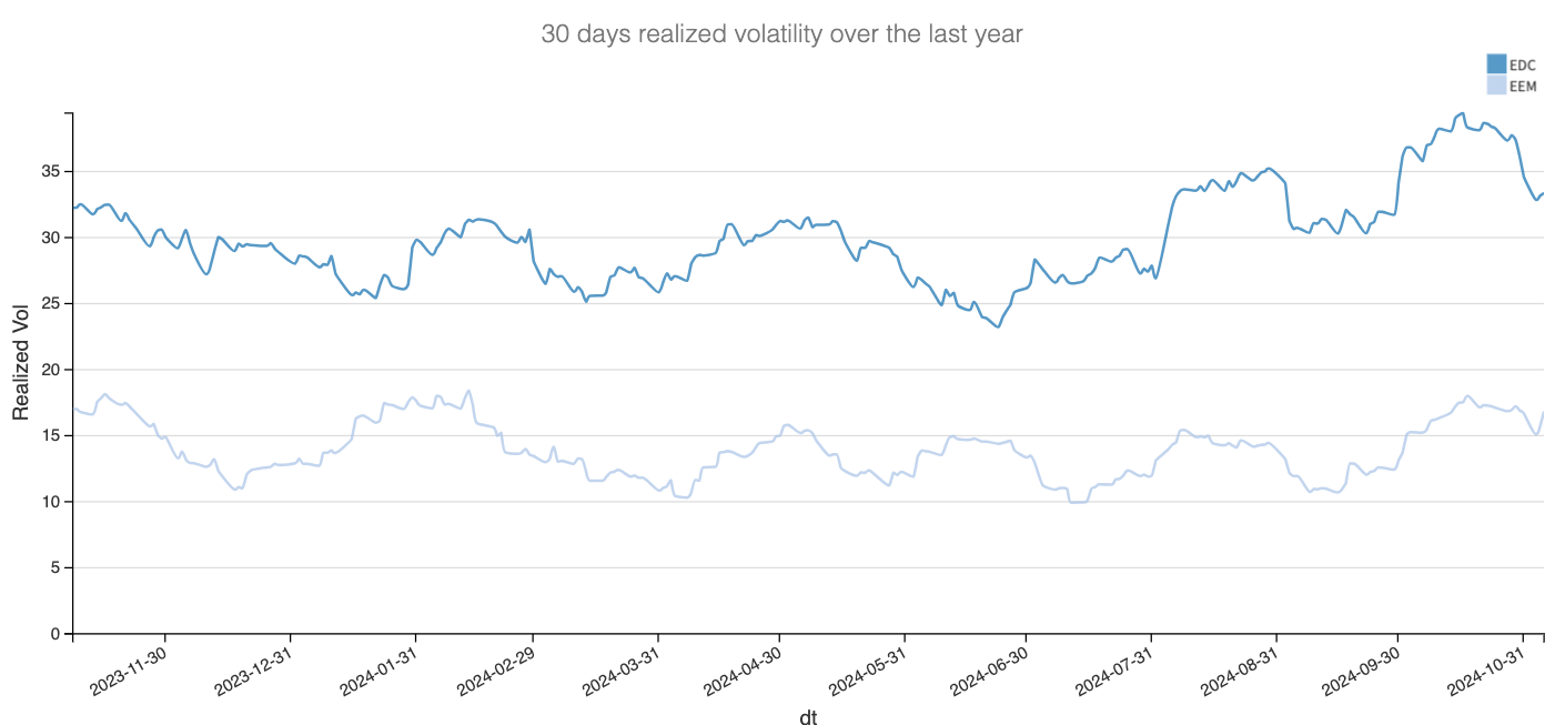The swings in EDC are far more dramatic, and, as expected, its realized volatility profile bears little resemblance to that of EEM. While EEM generally maintains relatively low volatility (owing largely to its components—well-established companies in Korea, China, India, and Brazil—is “emerging markets” even the right label? But that's a discussion for another day), EDC is an entirely different story.