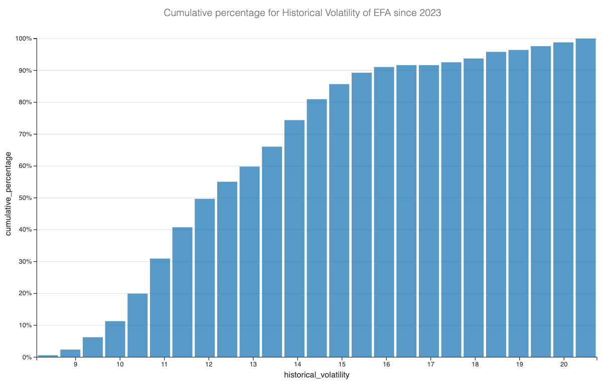On the realized volatility front, things have been fairly quiet in 2023, and except for a brief passage around 20 during the regional debt crisis in the US, the ETF spends much more time between 10 and 15.