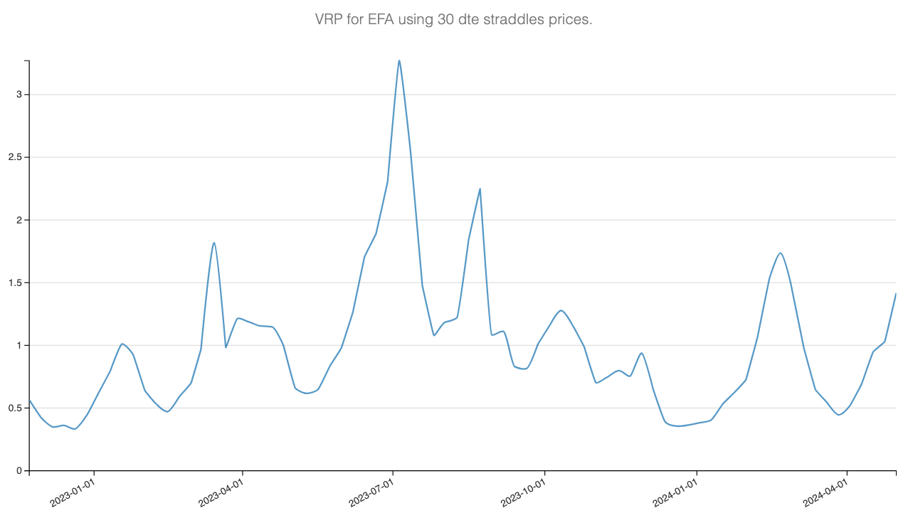 Without normalization, we can see that this ETF spent a fair amount of time with a 30-day VRP below 1. What can we do with that information? It shows that as a relatively stable ETF, the options market usually apprehends the risk at 30 days relatively accurately and would even understate some of the movements in the underlying (particularly to the upside, as this ETF overall goes up over time).
