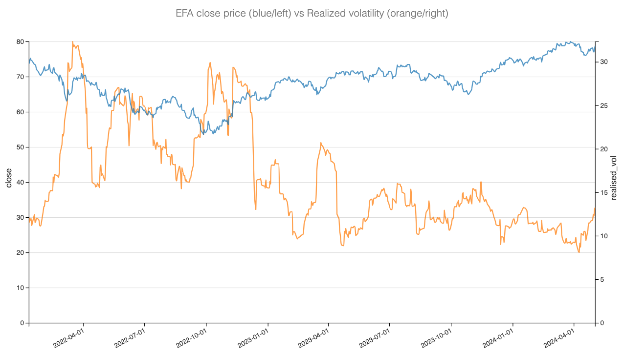As expected, EFA's performance correlates with the leading benchmark, the S&P 500. We can observe the same pattern from the end of Q3 2023 to the end of Q1 2024, with a monster rally taking it 20% higher.