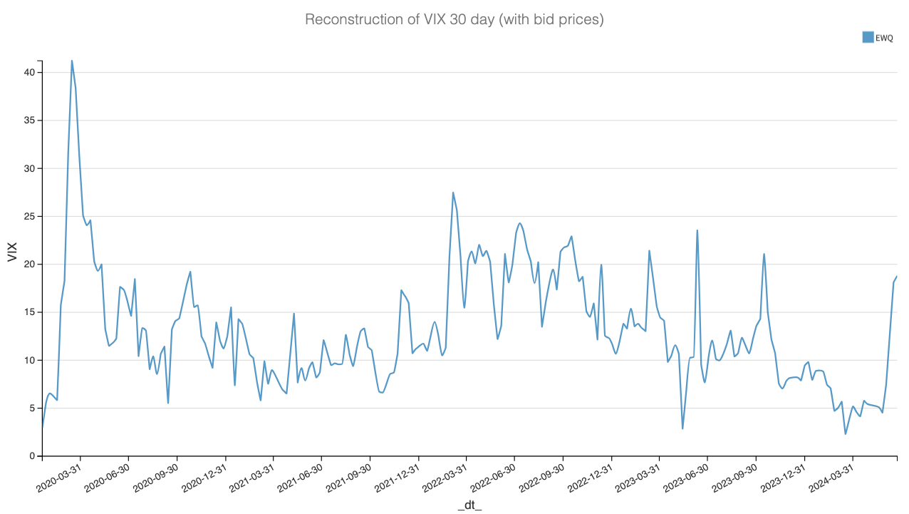 Let’s start by reconstructing the VIX index for EWQ using bid prices in the option data.