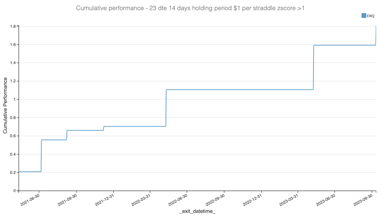 Let’s start by reviewing the performance of selling straddles in EWQ only when the VRP is stretched.