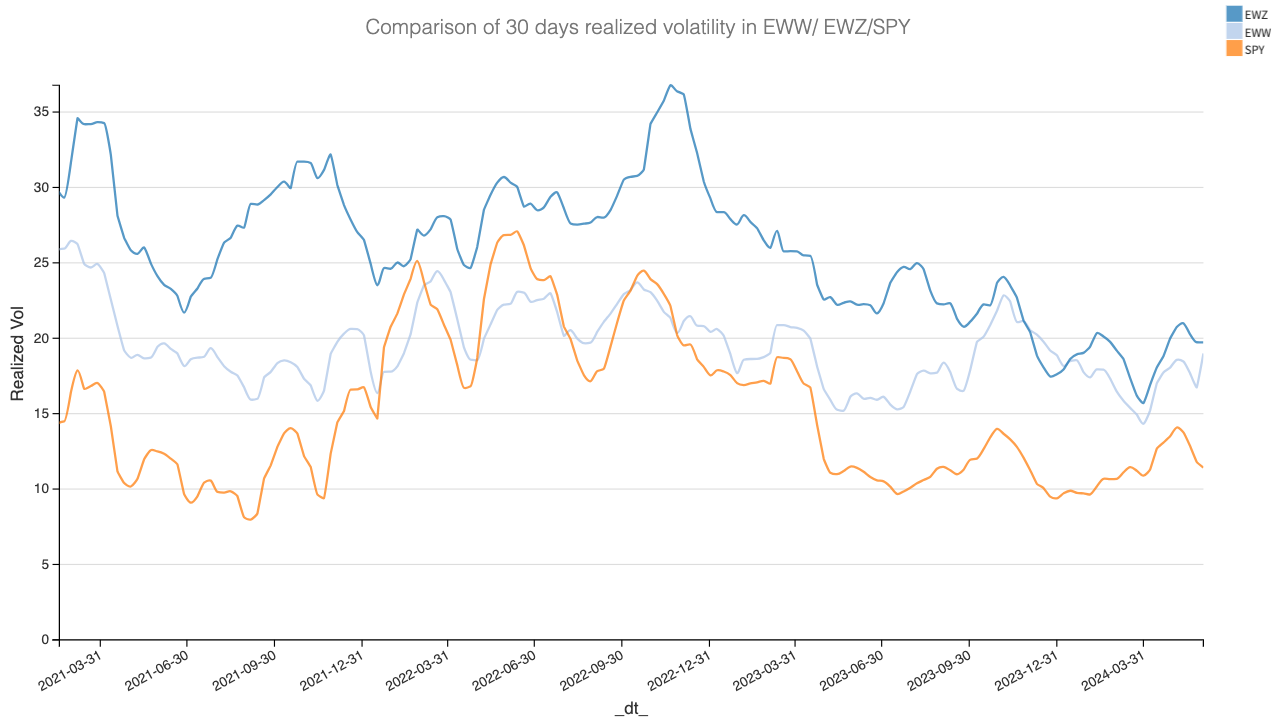 Even though there is a premium over US equities, the action has been fairly contained. It has realized less than 20% over the past 30 days and is still underperforming EWZ, which is not in an election year!