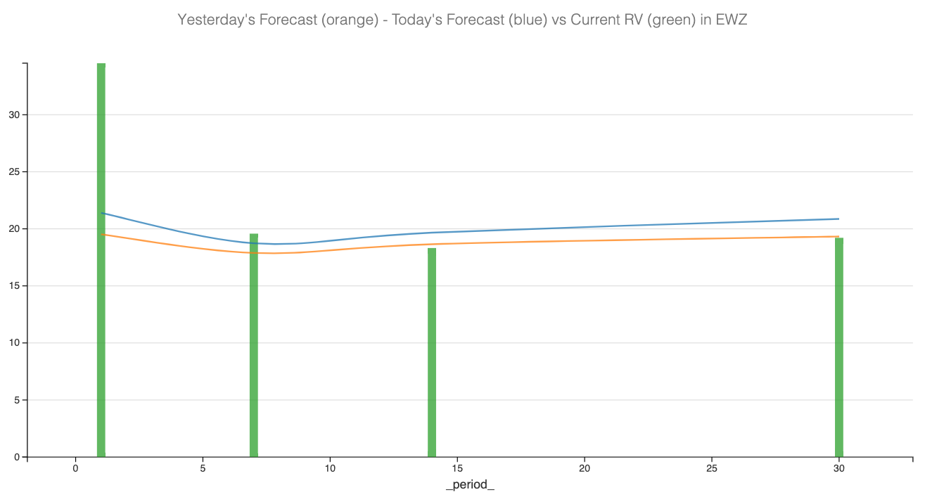 We forecast realized volatility to hover around 20% over the next two weeks to a month. With that in mind, let’s examine the options data to see how we could structure a trade in this product.