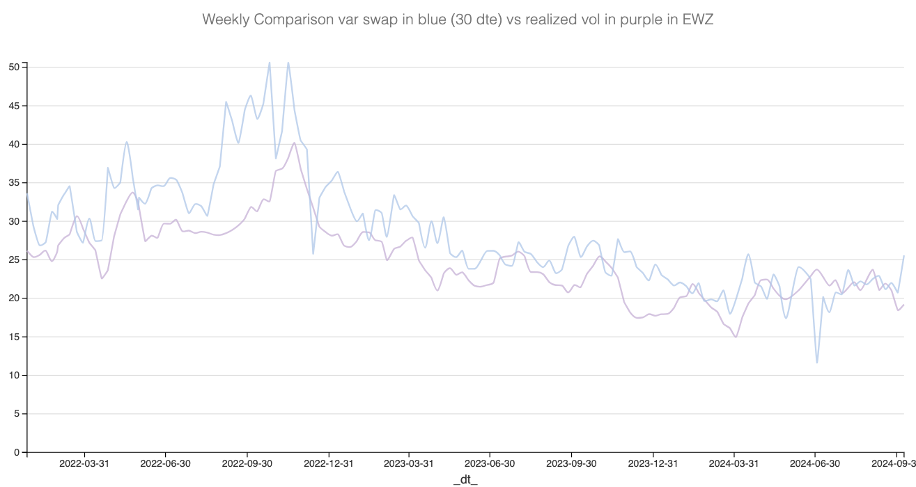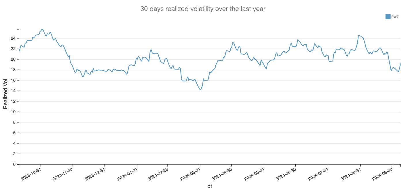 Currently at 19%, we’re in the middle of a fairly consistent year for volatility in Brazilian equities. Based on this chart, it’s hard to envision realized volatility shooting much higher than 24%. Of course, political risk always lurks in the background, and we can never predict every twist, but nothing on the calendar gives us cause for concern, which lends more credibility to our predictions.