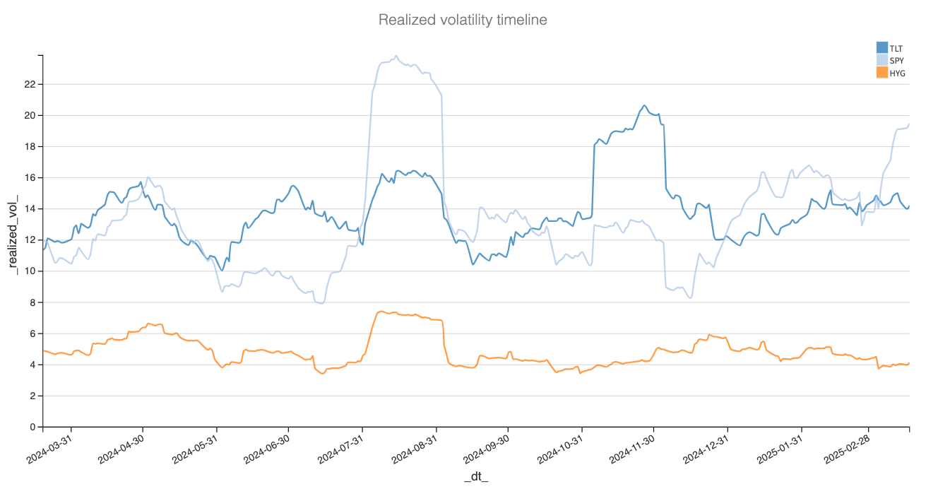 Realized volatility-wise, the contrast is even more striking—every equity shock in 2024 was mirrored by a move in bonds, but not in 2025, where things have been pretty quiet. So quiet, in fact, that in the case of HYG, this might be one of the calmest periods in the bond sector over the past few years. We’re not bond experts, but that does come as a bit of a surprise given all the chatter about a potential recession, slow growth, and the impact of tariffs on corporate balance sheets.