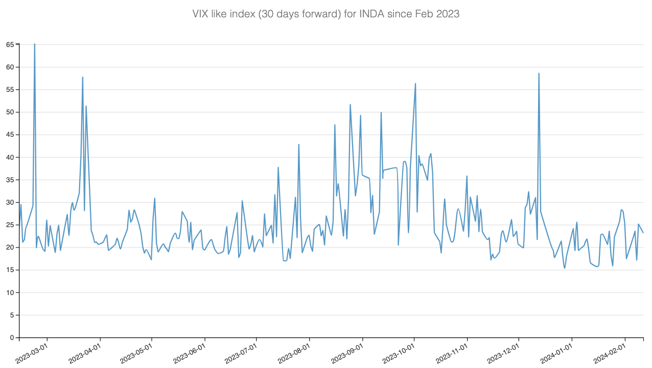 Let's take a closer look at the volatility landscape of INDA by examining a VIX-like index constructed from the prices of 30-day options.