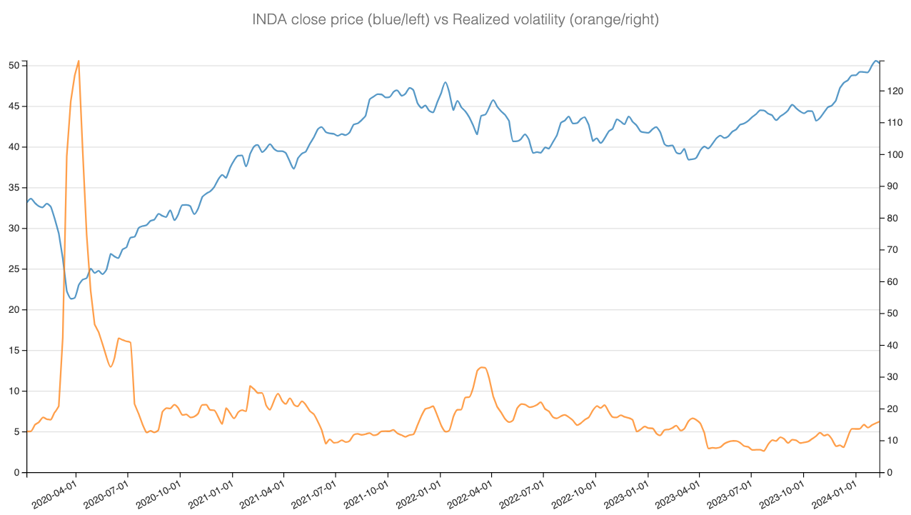 The upward trajectory of INDA since the COVID-19 lows showcase not just growth but stability, with realized volatility remaining relatively contained, barring sporadic spikes in early 2022 and 2023.