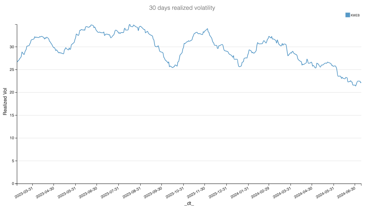 The realized volatility in KWEB has been on a steady downtrend since the beginning of the year and is now at a low of 22.5%.