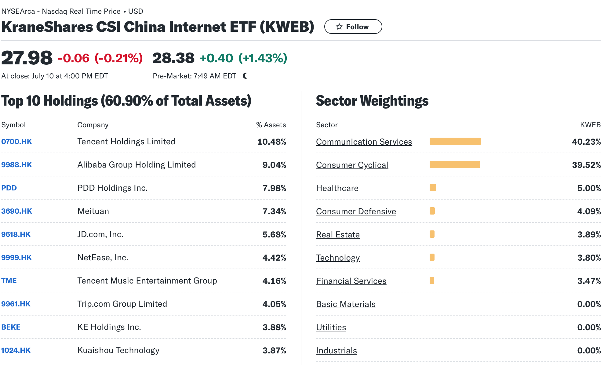 Before diving into the volatility analysis, let’s understand what is in this ETF. KWEB has been around for about ten years. It is quite concentrated in companies mainly active in e-commerce and communication, and as such, its main holdings are Tencent and Alibaba, representing about 25% of the fund’s positions.