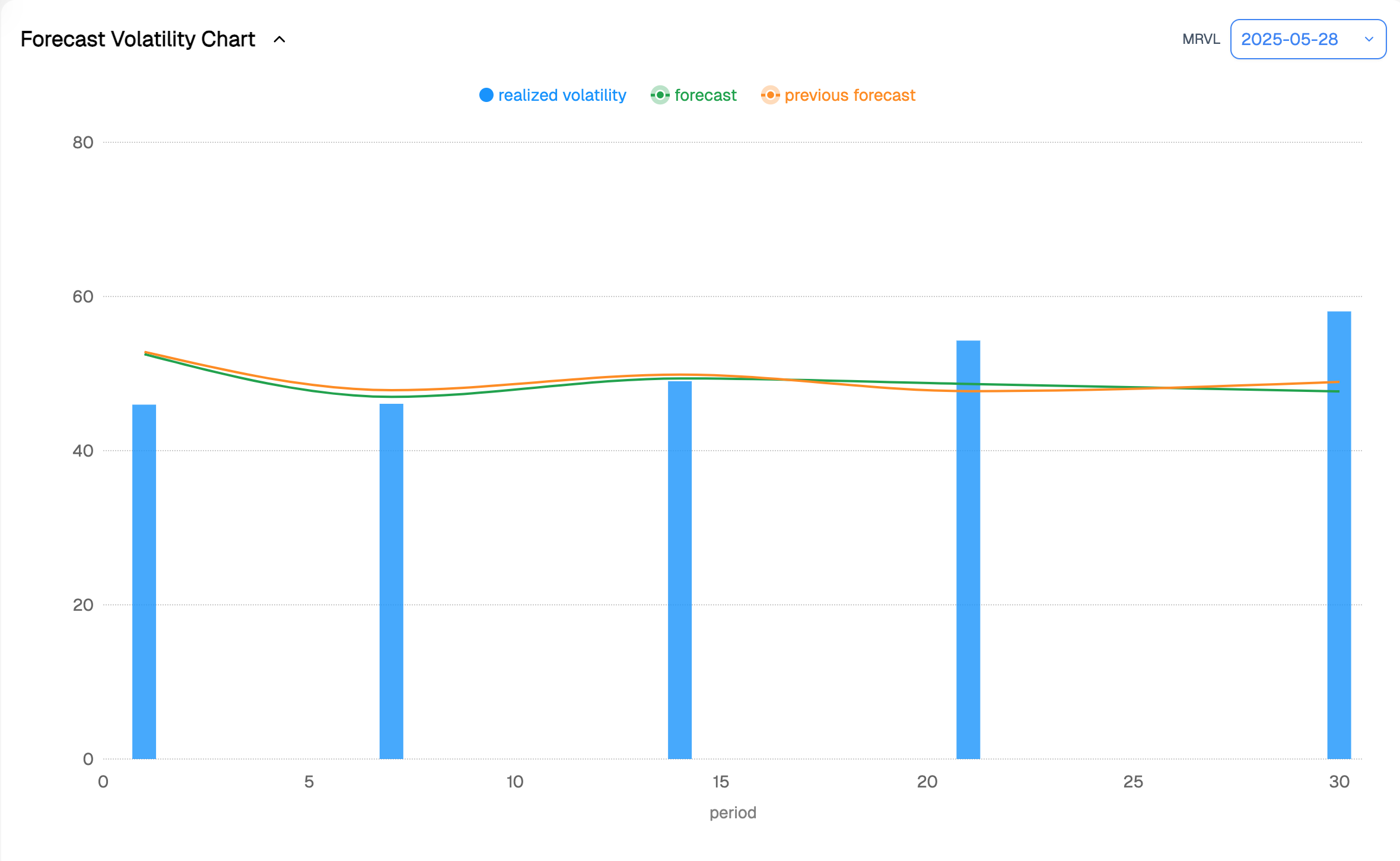 Looking at the forecast for realized volatility in MRVL, we expect it to hover near current levels—roughly where it has been throughout May—and drift slightly lower over the next 30 days, settling somewhere in the high 40s to low 50s.