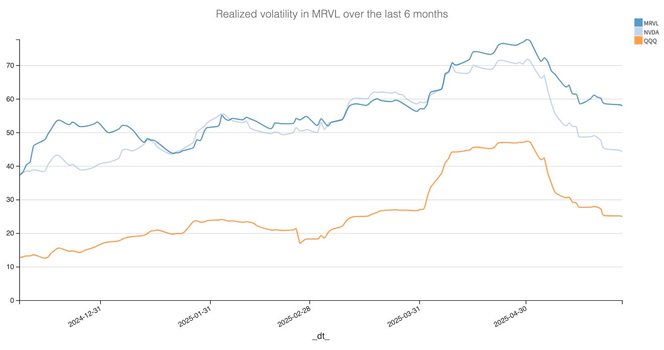 But unlike NVDA, which is now drifting toward its lowest realized vol levels in months, MRVL is not there yet. At 60% annualized, it is still running noticeably hotter than anything we saw before April 2025.