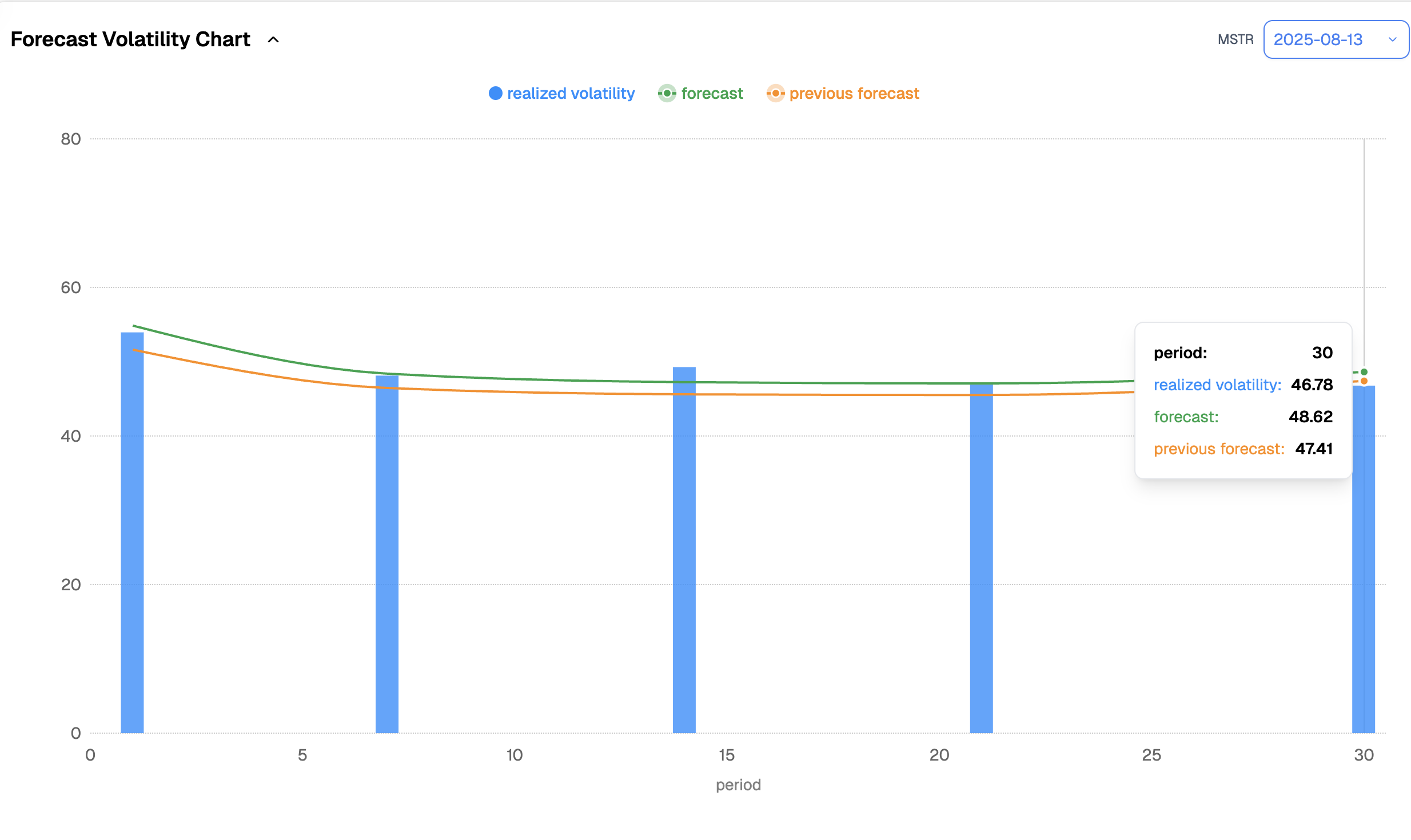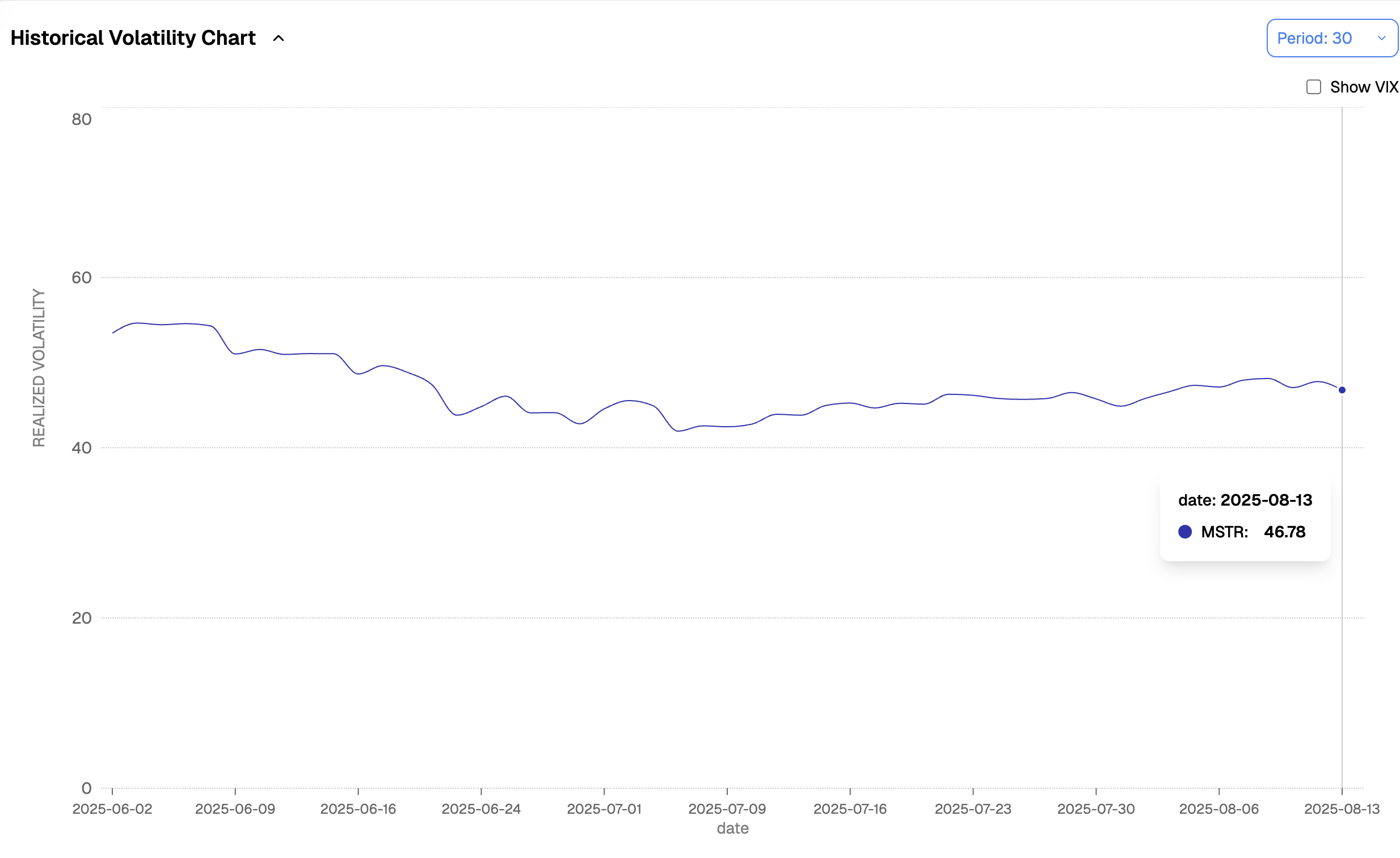 Given the mean-reverting nature of volatility, we often say today’s vol is a pretty good proxy for tomorrow’s. MSTR is a prime example: if nothing changes, you should expect somewhere in the 45–50 range over the next month.