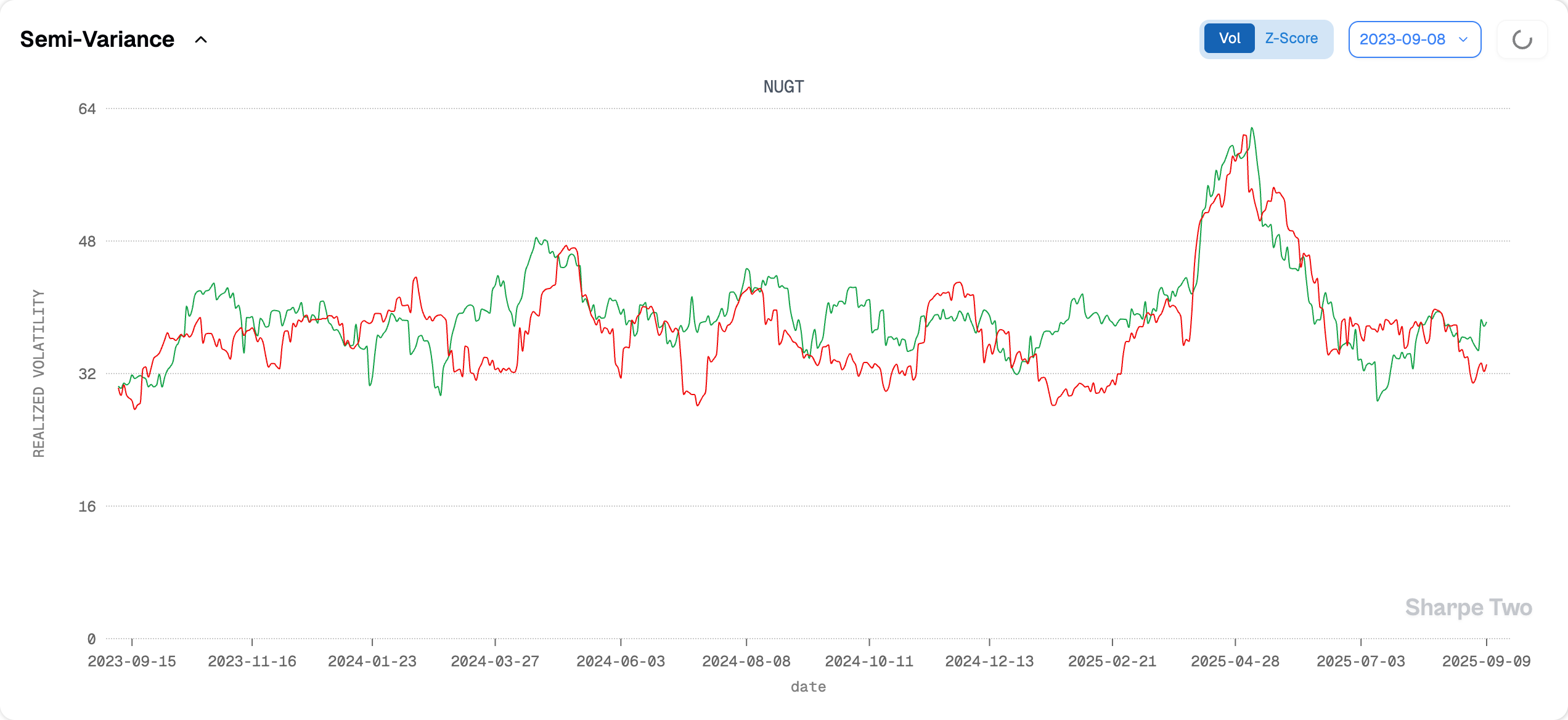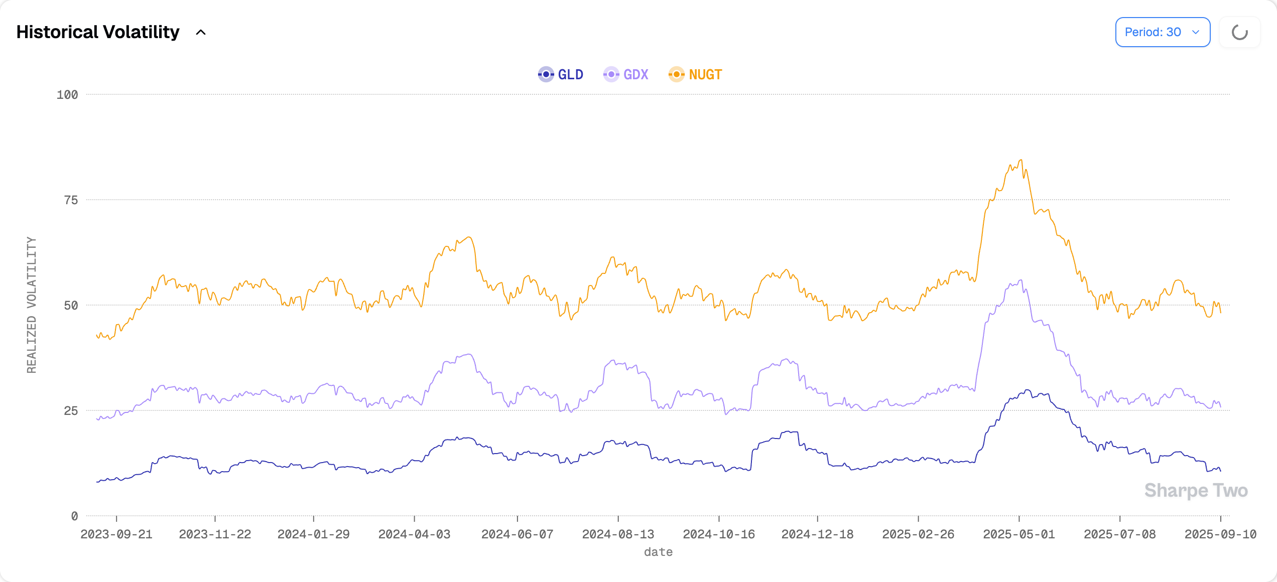 At 48%, NUGT is not for the faint of heart. Still, realized vol now sits at its lowest level in two years—far calmer than during past flare-ups in risk assets, like August 2024 or April 2025.