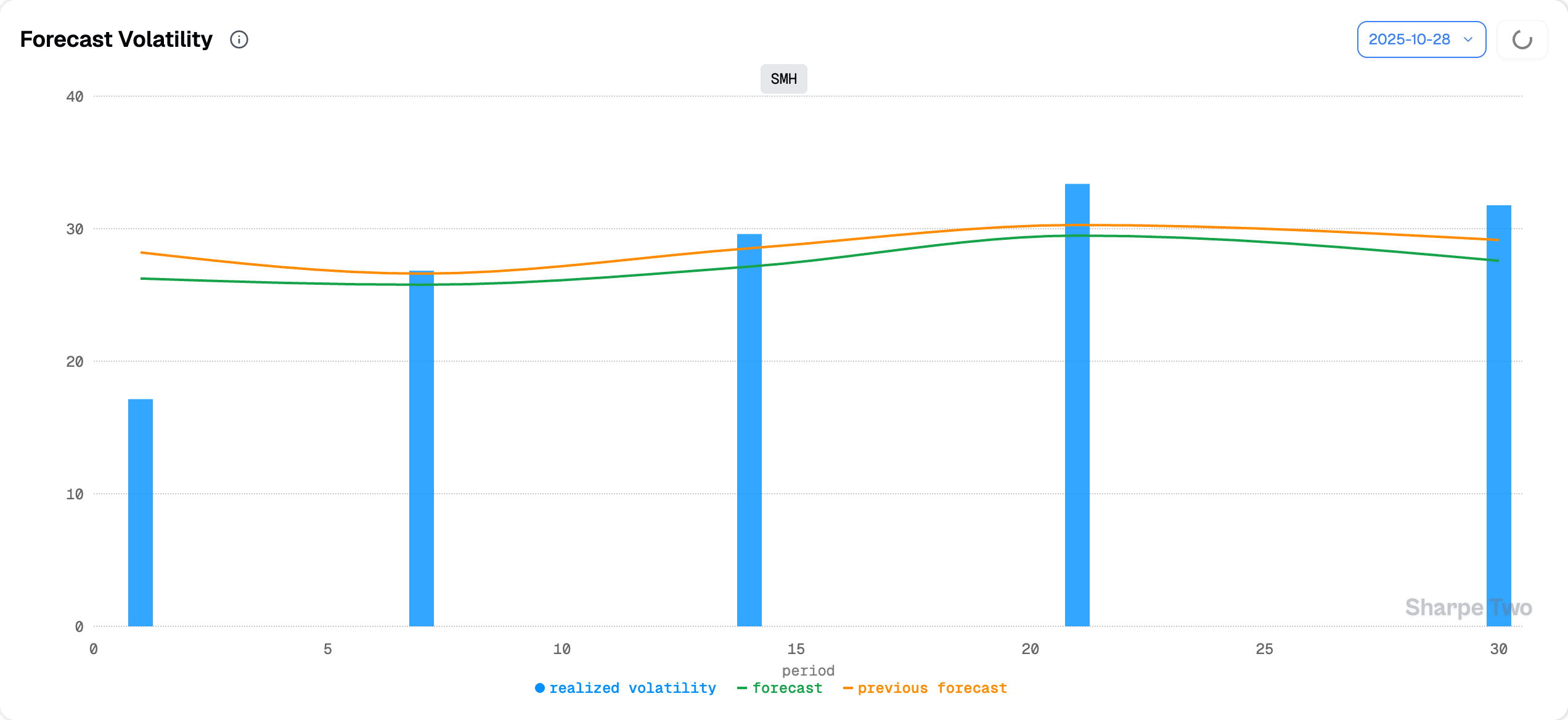 We’re now trading around a more normal 32% and roughly what we’ve been accustomed to seeing in SMH when things aren’t in hyper-stress territory. Could volatility keep rising from here? Absolutely. We’re in the thick of earnings season, and partnership announcements between major semiconductor players are flying left and right, the same wave that just propelled NVDA to become the first $5 trillion company ever.