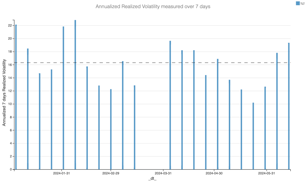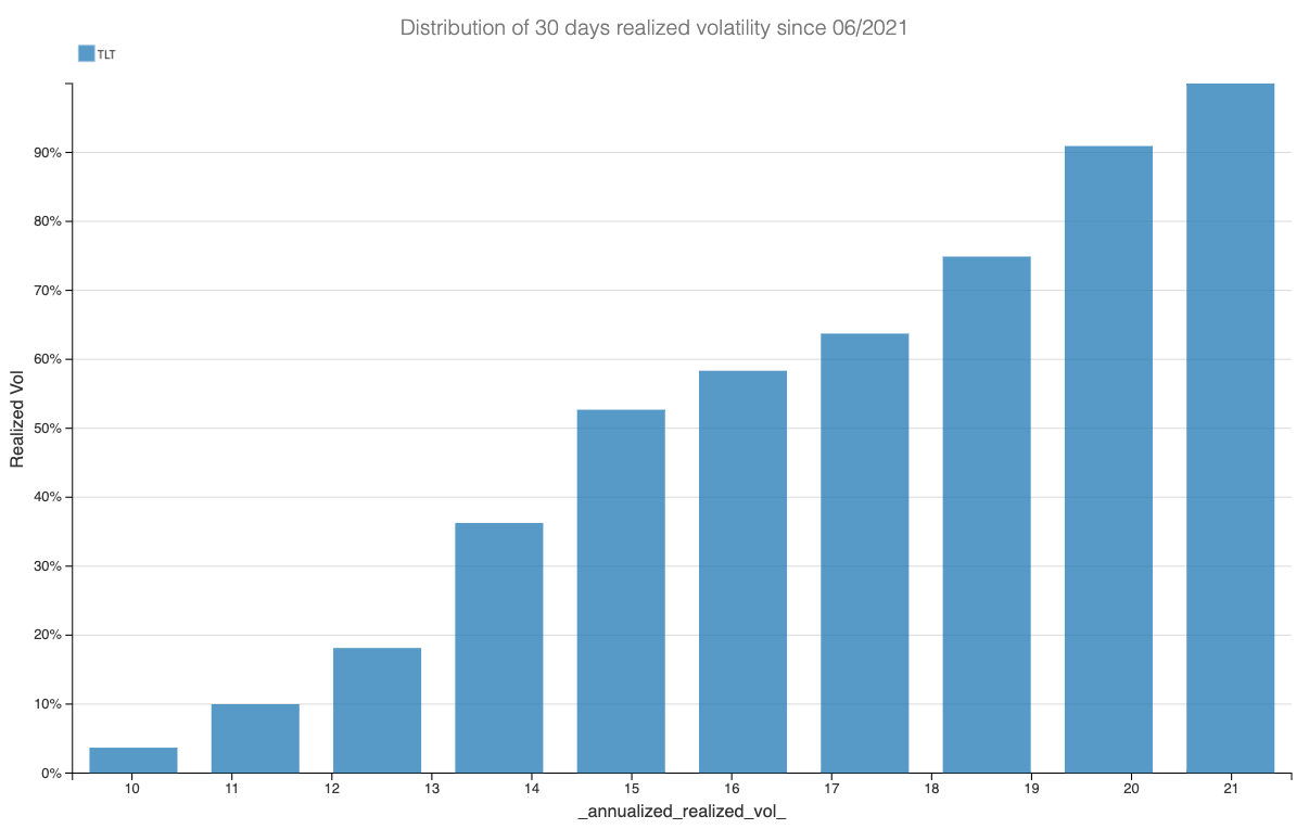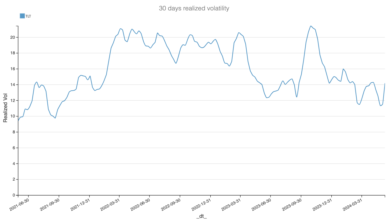 Yet, in early June and the days leading up to the latest FOMC meeting, realized volatility returned to its highest level observed this year. However, it was still well below the threshold of 16, which could be considered a pivot for regime detection in TLT.