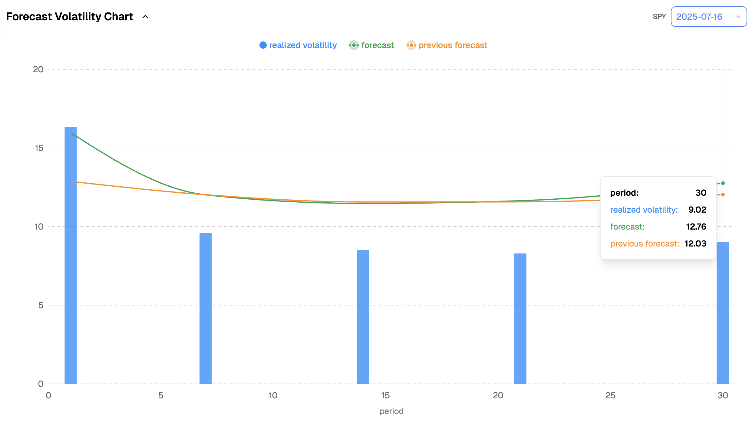 Let’s pause on that. A forecast is useful for setting expectations, not for achieving perfection. The way we read it: realized vol has been low, and we do not expect it to break meaningfully above 15 over the next 30 days. If it lands right around 12, that is even better.
