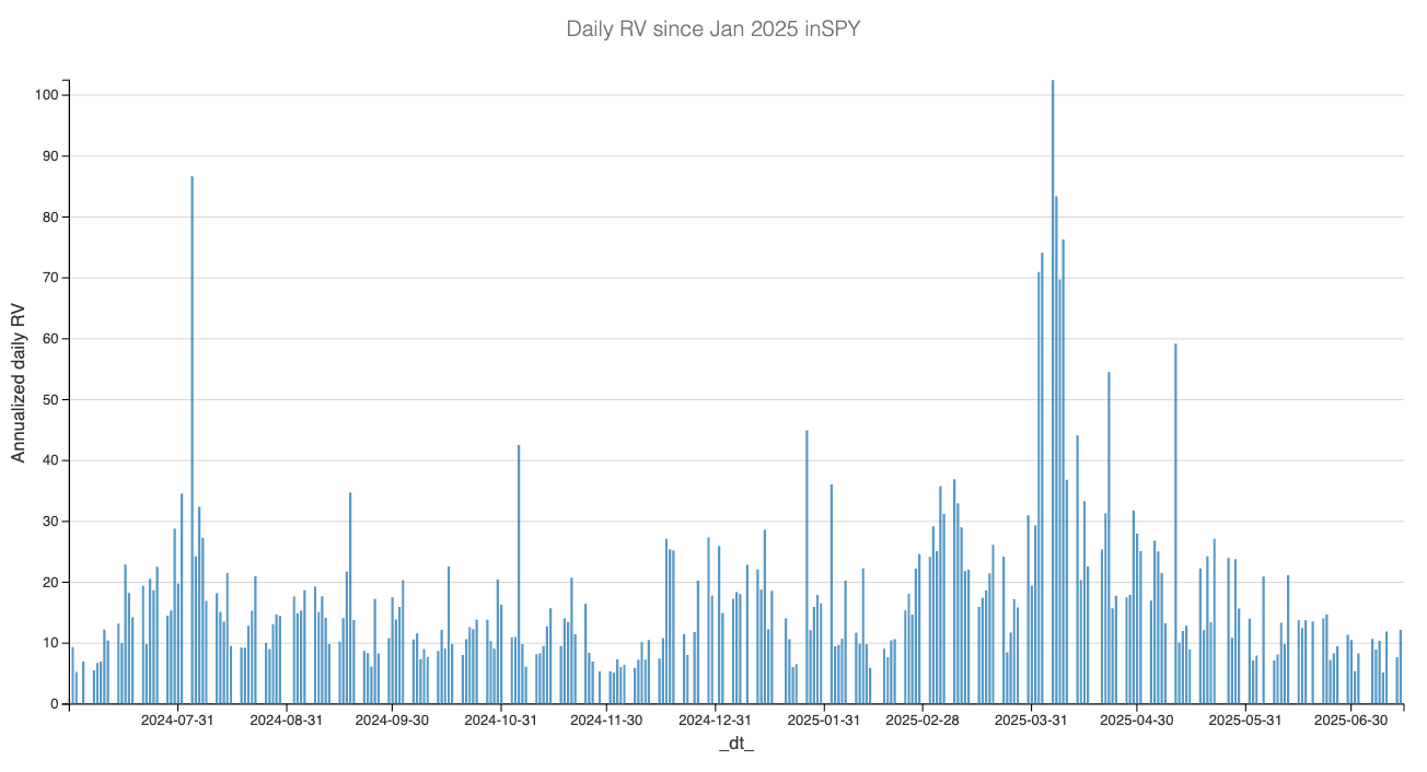 The market is so quiet, it’s boring. Right before our summer break, we encouraged you to step away from the screens—and we genuinely hope you did. Over the past month, daily realized volatility has barely scratched 20. Even yesterday’s brief swoon on the Powell rumor barely moved the needle.