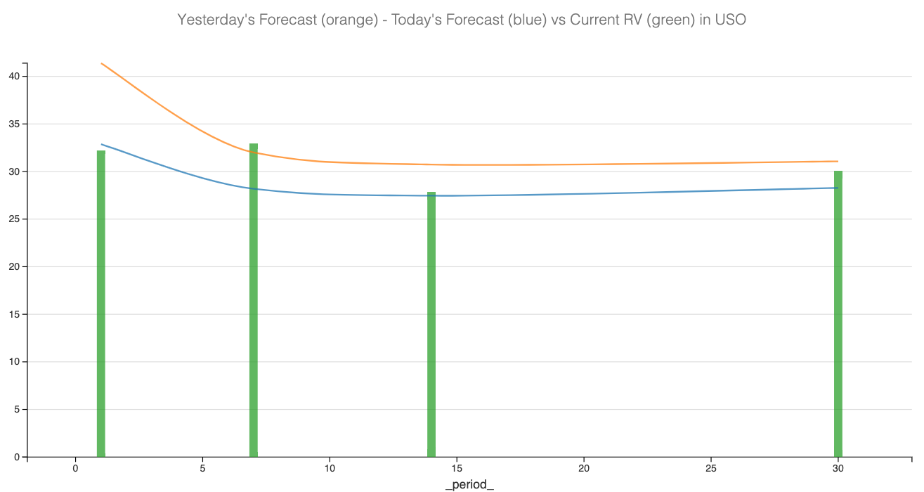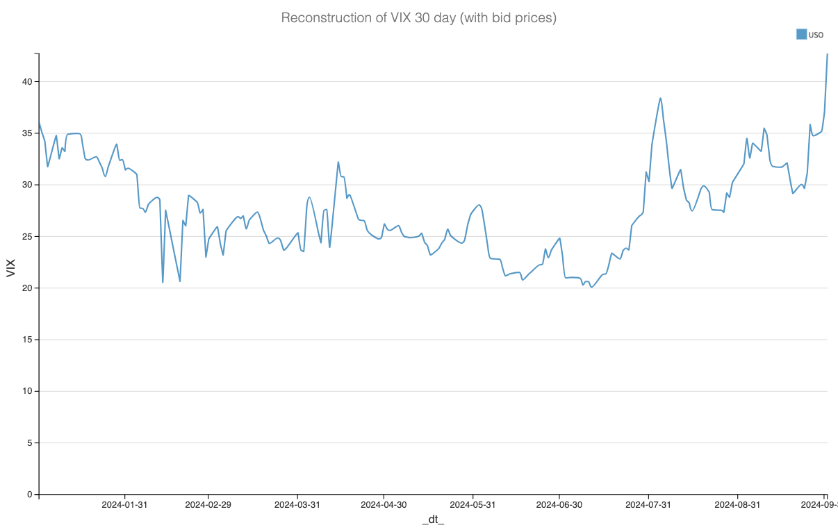 Let’s start by looking at a reconstitution of the 30-day VIX index for USO. The demand for 30-day options in USO is rising, to say the least.