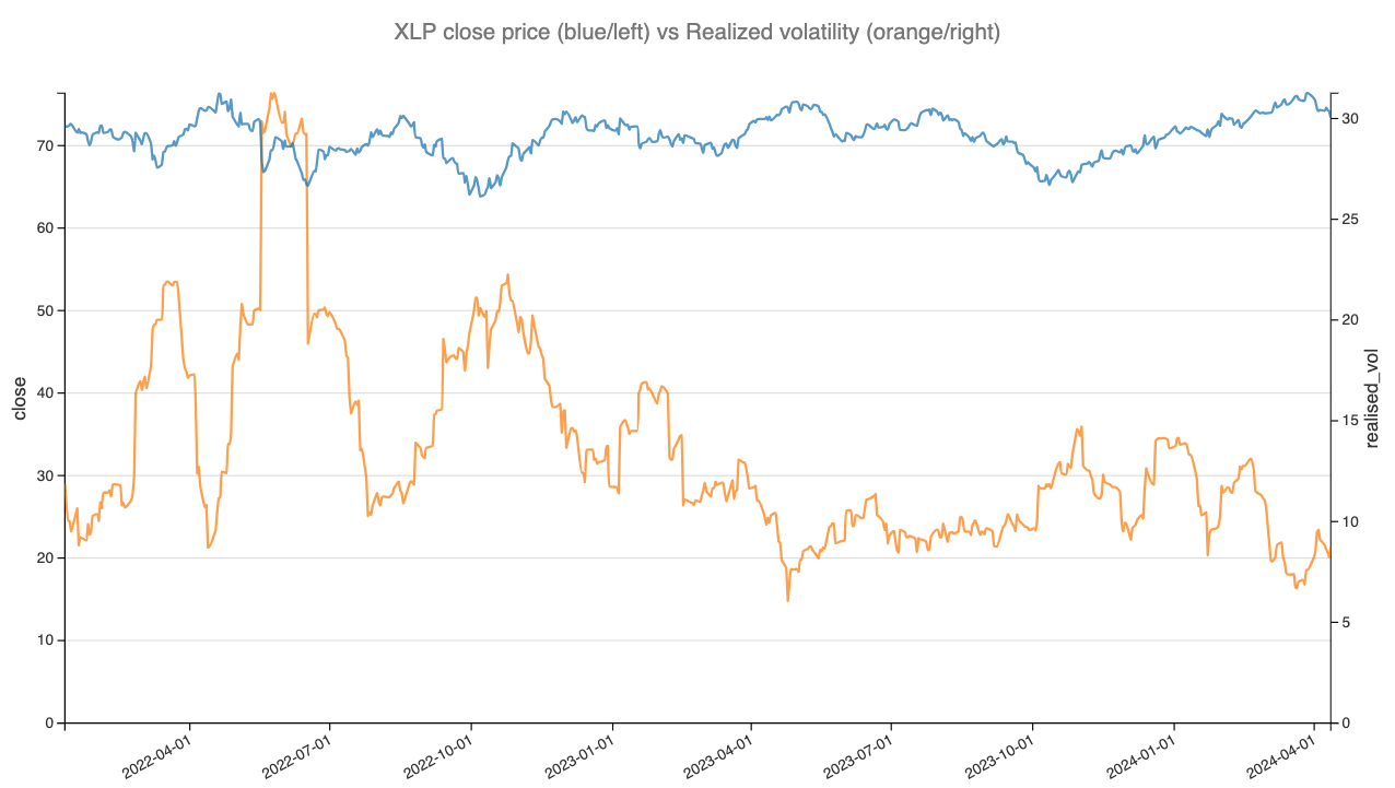 Despite the war in Ukraine, seven rate hikes, a regional bank crisis, some intense debate about inflation, and a crazy six months, XLP has remained steady, hovering around $70. Its realized volatility, however, hasn't gone above 15 since January 2023, and it spent all of Q1 2024 below 10.