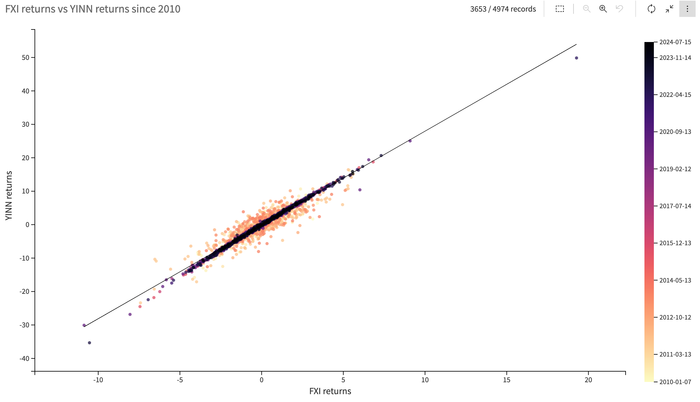 Percentages and prices are always very deceptive and hard for the human mind to fully grasp. The picture looks much better if we compare the daily returns of YINN and FXI since 2010.