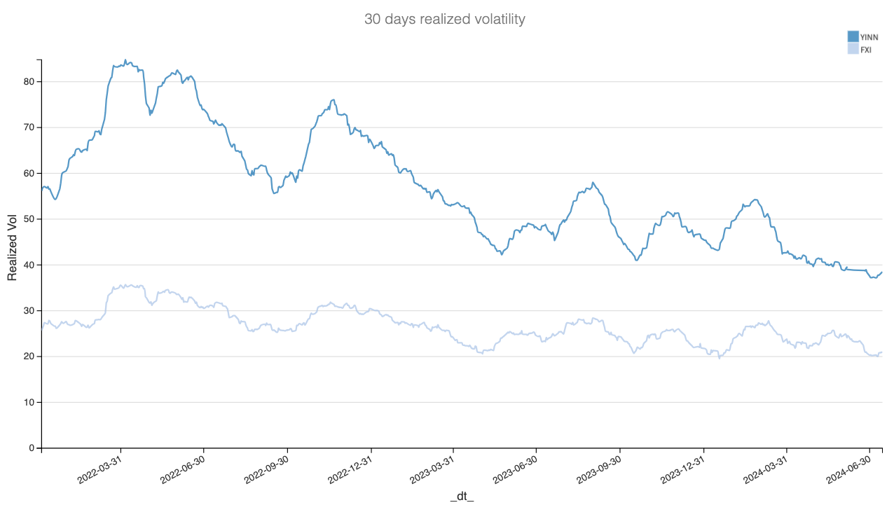 YINN is FXI on steroids: it aims to replicate three times the daily performance of the FTSE China 50. You might be jumping in your seat, looking at this chart, and thinking, "Well, clearly, they are not doing a really good job at it: FXI is up 13.7% while YINN is up 26.45%." And… you would be wrong. The same "optical illusion" happens when you look at the realized volatility chart.