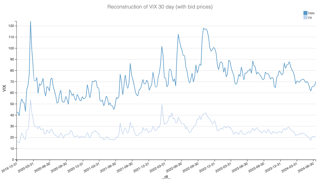 Let’s start by looking at the implied volatility at 30 days for YINN, calculated using the VIX formula (interpolation between two variance swaps around 30 days to expiration).