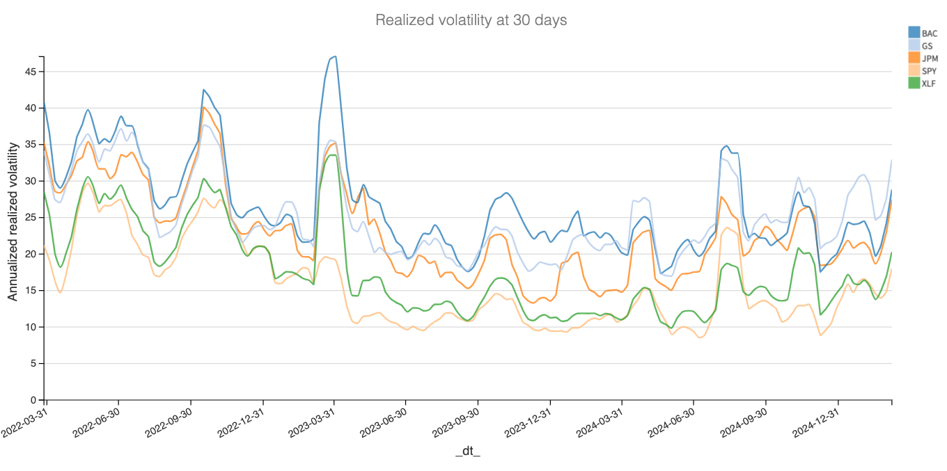 GS is particularly interesting—without any major negative headlines, it has taken the lead in realized volatility among its peers, which wasn’t necessarily the case over the past year. Again, we’re not making a judgment on the stock’s quality versus its competitors—just an observation.