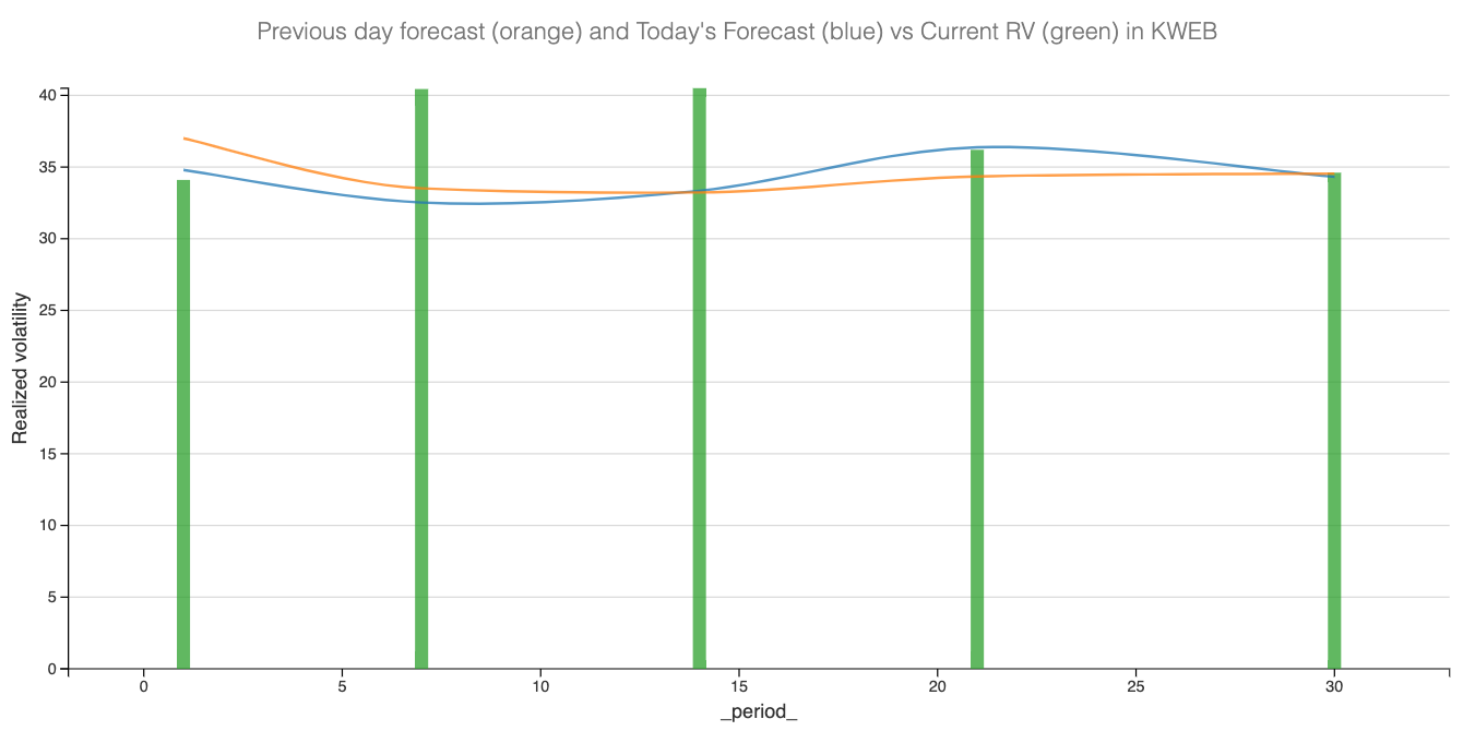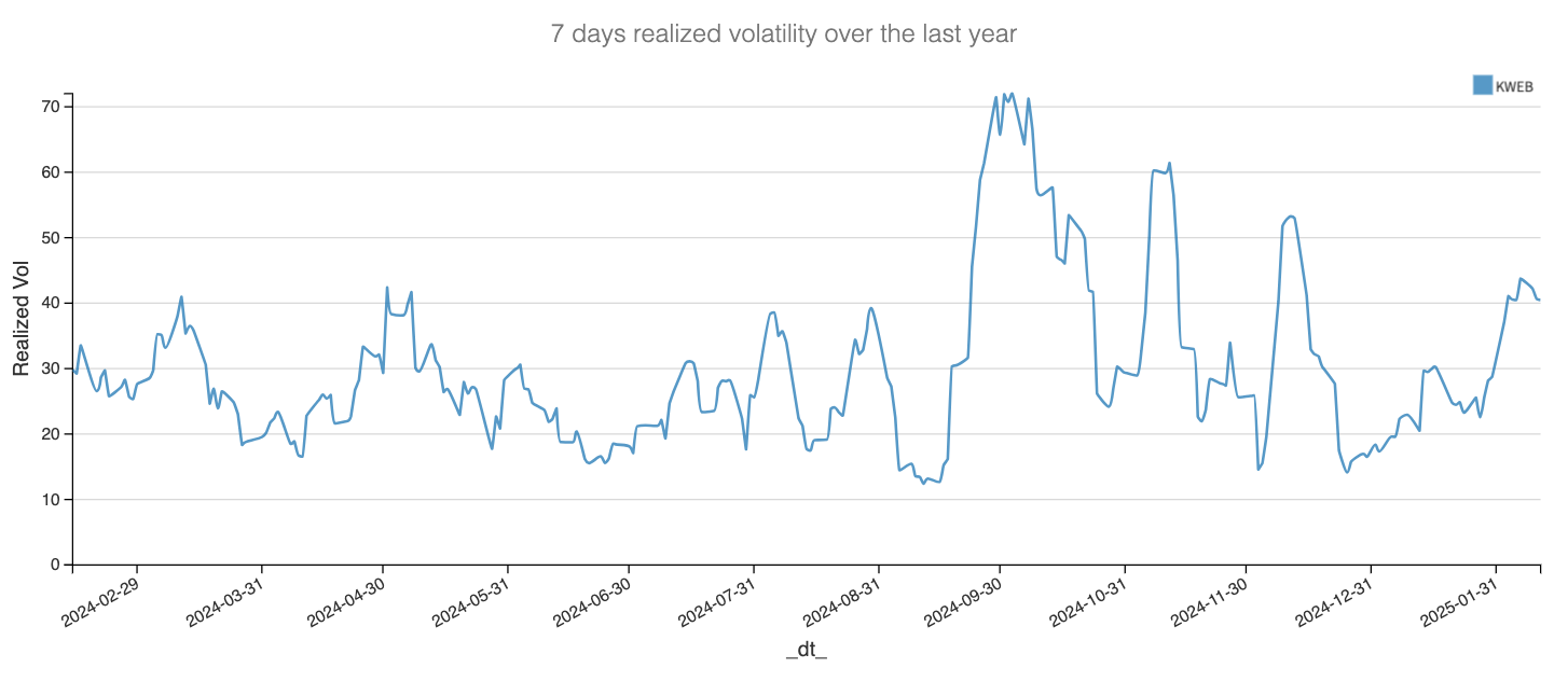 While it’s still too early to gauge the full impact of how fund managers are rethinking the AI thesis, KWEB’s 20% gain over the past month makes it clear—it’s significantly outperforming its US counterparts. Big moves like this tend to leave a distinct mark on realized volatility. Let’s take a look at the short-term volatility in KWEB: