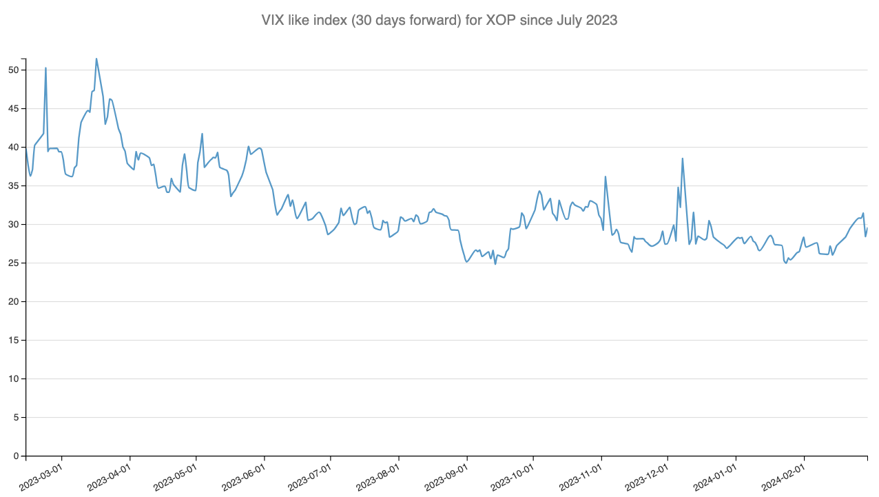 By applying the CBOE methodology, we've reconstructed a VIX-like index for XOP, focusing on options with approximately 30 days until expiration.