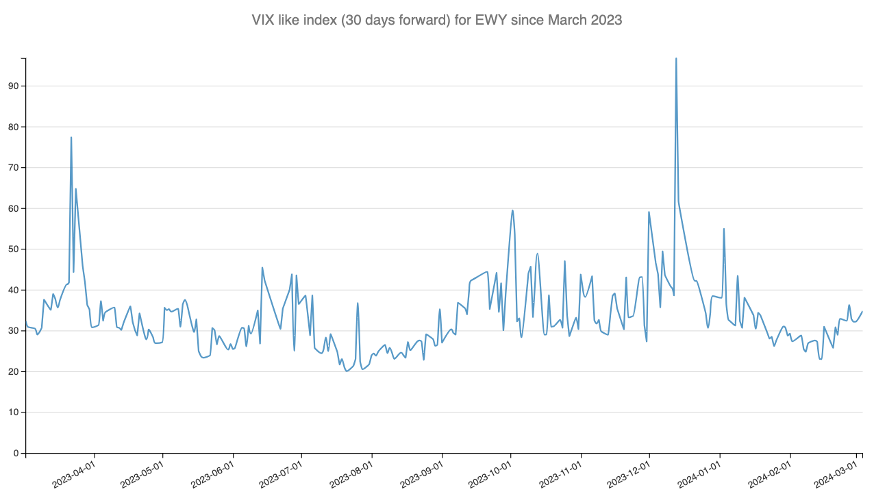 A reconstitution of a VIX index for EWY over the past 12 months shows that we are not in a turbulent period like what we’ve observed in Q3 and Q4 2023. However, sitting at almost 35 signals that the prices of options are overestimating the realized movement in the underlying.