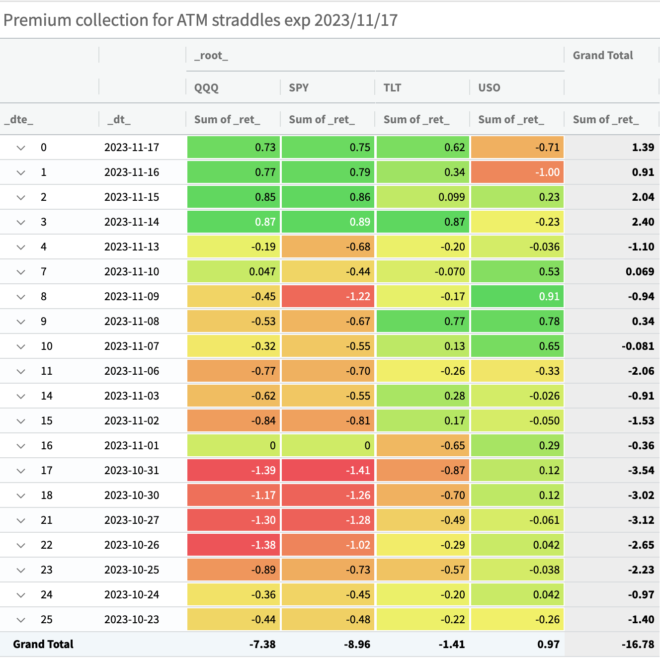 Take, for instance, our recap of ATM straddle sales expiring in the November cycle across QQQ, SPY, TLT, and USO (sell every day the ATM straddle expiring on 2023/11/17). We kicked off at the end of October when the VIX was hovering above 19. The outcome? Most of these trades didn't hit the mark.