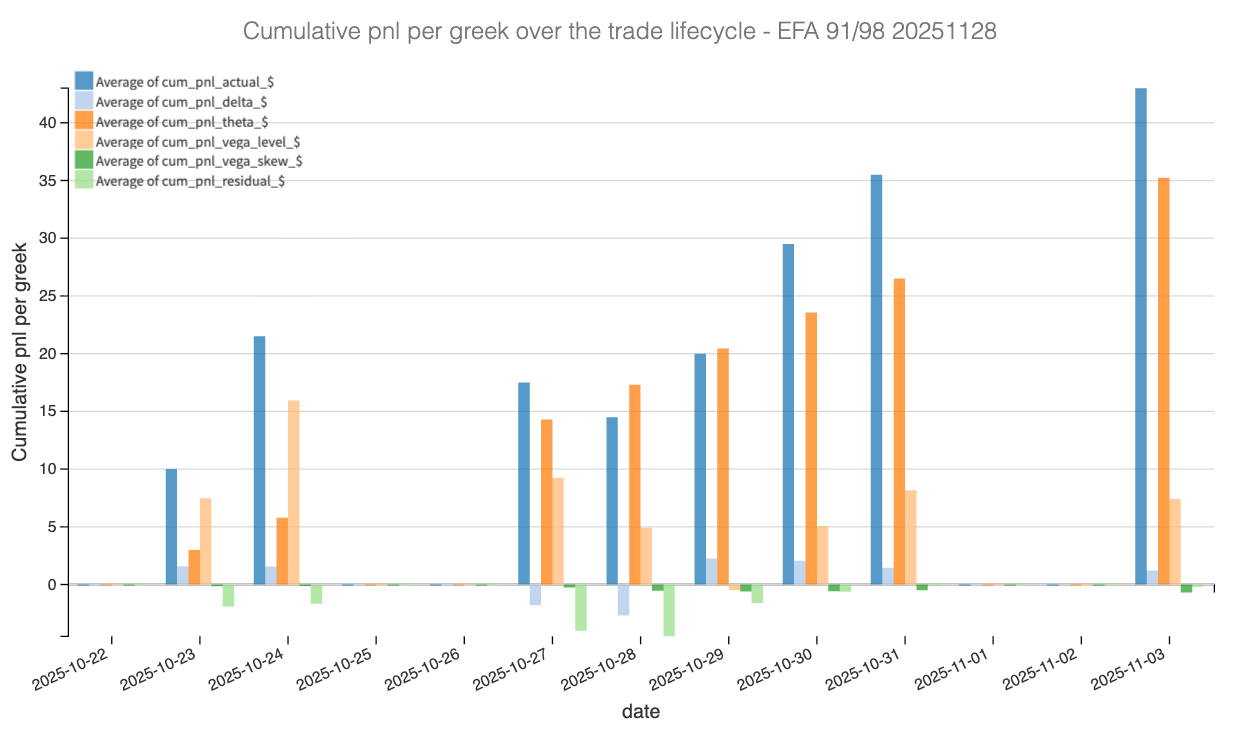 From that point, the position behaved like a textbook short-vol carry: theta grind dominated, residual effects stayed small, and skew remained stable. The combination of early vega crush and continuous decay allowed for an early, clean exit, proof that timing volatility dislocations correctly matters more than trying to forecast direction. In this case, trusting the data and acting decisively after the spike was the difference between hesitation and another smooth win.