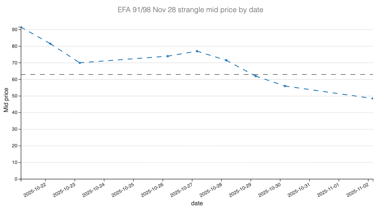 We emphasize this because it is a conversation we have had several times lately: taking profit at 25% is good trading hygiene. Holding for 50% targets something different; it assumes not only that volatility remains overpriced versus realized, but also that the underlying will not move enough to challenge your strangle or straddle. That is a strong assumption. In this case, the drift was limited, but we recently had a position in XLU where realized volatility sat well below implied, yet the trade still lost money because we did not hedge directional risk. Taking profits at 25% ensures you do not overstay your welcome and keeps you out of the trap of path dependency.