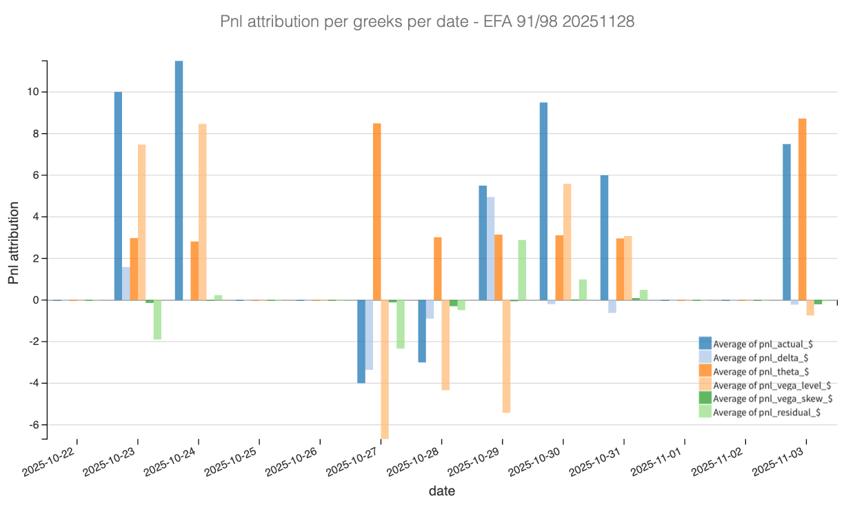 In the end, the underlying drifted quite a bit in the first part of the trade, from the 22nd to the 29th, as markets rallied in a sigh of relief after two complicated weeks. We would expect the delta component to have hurt the P&L early on, before easing as the market reverted. The interesting question is whether that initial drift was strong enough to offset the benefits of implied volatility compression and time decay.