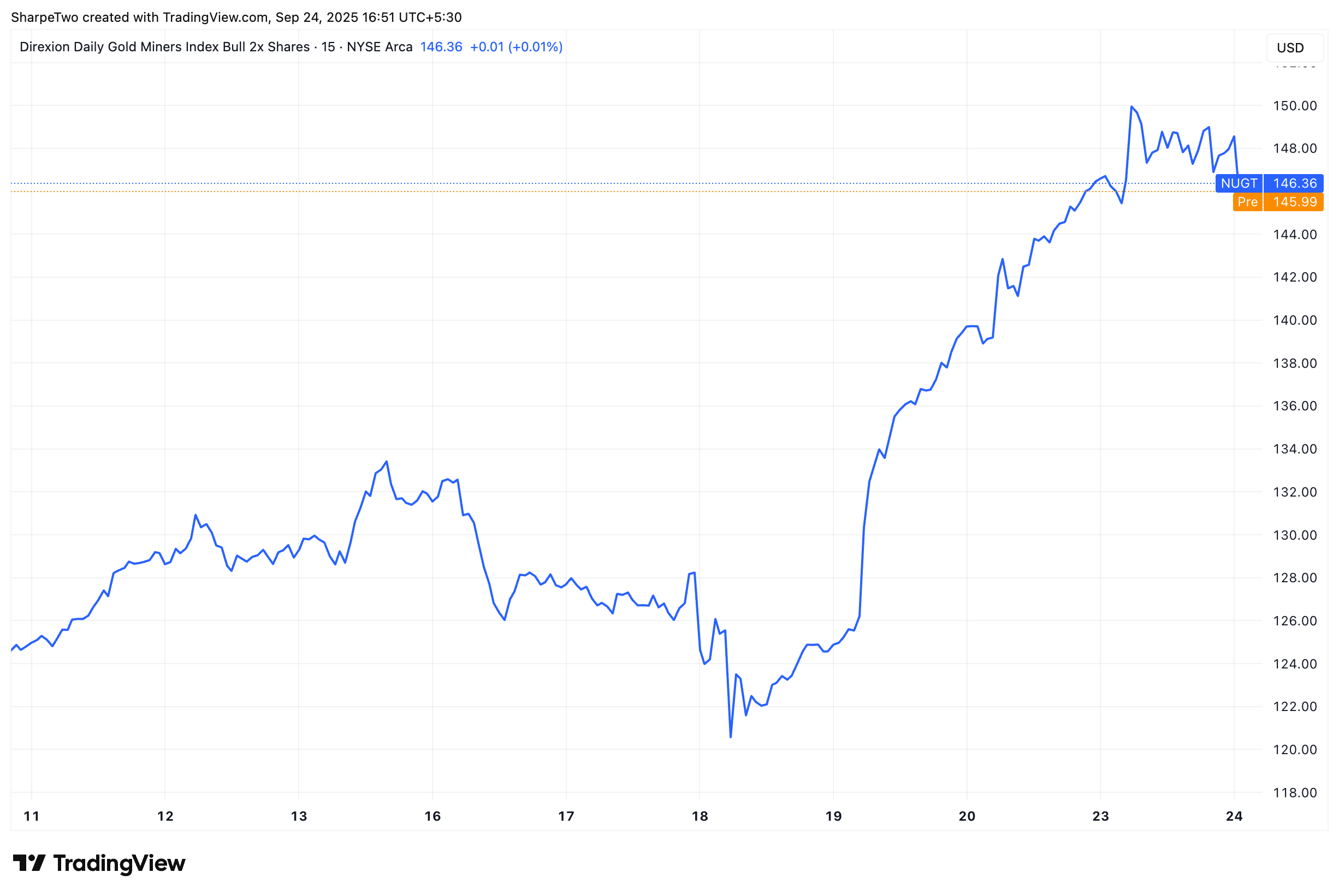 Two weeks ago we wrote about NUGT as the market was digesting inflation and jobs data, bracing for the FOMC. Gold has been in a parabolic run this year—up 42% in 2025, with little sign of cooling. And when gold runs, miners fly. NUGT, the levered ETF on the gold miner index, has ripped 291% as investors piled into mining names to ride the wave.