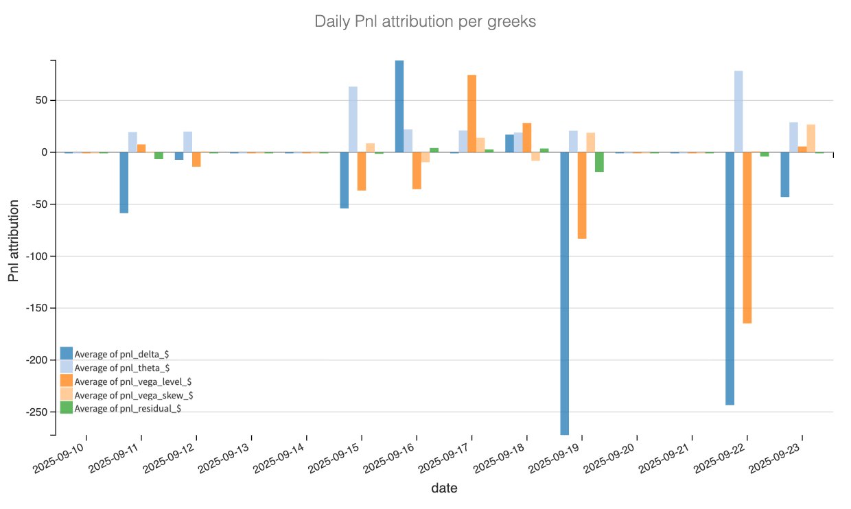 We decomposed the 100/150 strangle day by day, using end-of-day mid prices for options and translating the Greeks into dollar terms. As a reminder, our main buckets are delta, theta, vega level (parallel shifts in the surface), and vega skew (put/call shape). Finally, we use a residual bucket to capture higher-order path and effects.