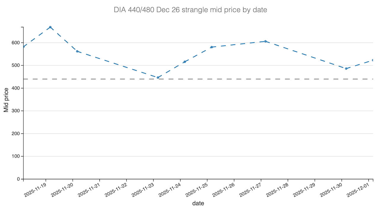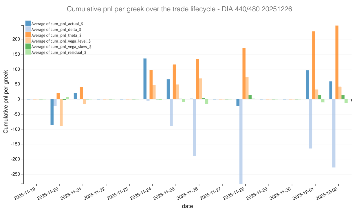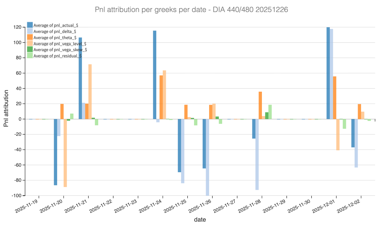 The attribution tells a very clean story. The bulk of the noise came from exactly where we expected it: the delta. As DIA grinded higher throughout Thanksgiving week, the short strangle naturally picked up directional exposure, and without any hedging this bled steadily into the PnL. You can see the effect clearly in the cumulative chart: delta chipped away at the trade almost every single day once the index moved from 460 to 475.