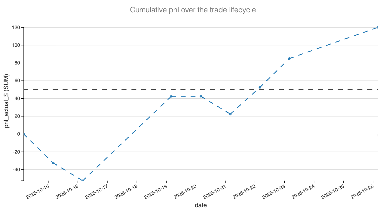 The picture flips on 20 Oct. Implied came in from the high-60s toward the mid 50s and the vega-level bar towers over everything else. Theta also prints solidly positive on that day. From there, the grind higher in spot plus cooling IV produced a clean two-engine rally in PnL: steady carry and bursts of vega-level wins on 23–24 Oct and again near the exit window. The delta line turns from red to slightly positive late in the sample, which is what you want after the scare: no persistent trend stressing a wing, just oscillation around the middle of the strangle.