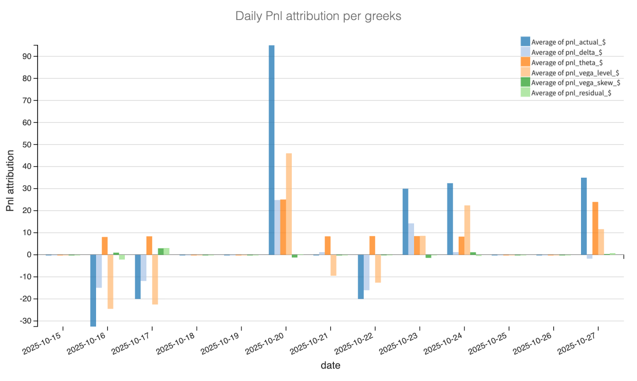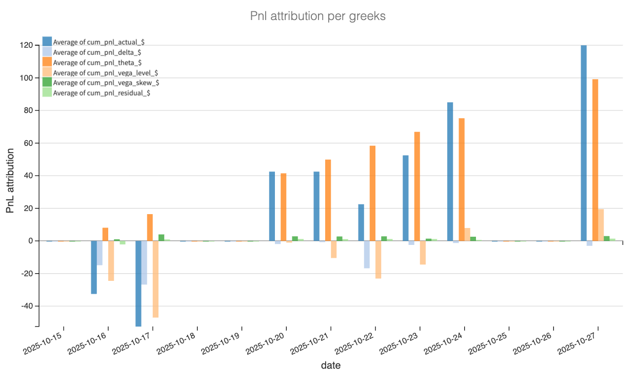 Theta is a smooth staircase up, the metronome of the trade. Vega-level is lumpy but decisive, accounting for the bulk of the gain after 20 Oct. Delta nets out small negative to flat, which validates the choice to stay close to delta-neutral rather than chase a view. Vega-skew remains a rounding error throughout, consistent with a balanced structure where we were not trying to monetize one side of the book. Residual is close to zero, so the attribution behaves.