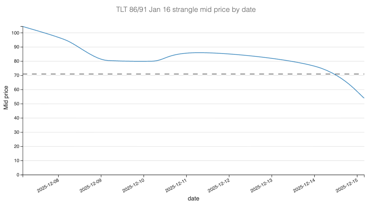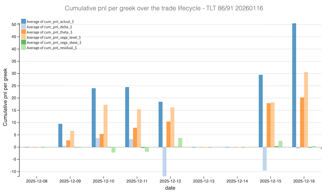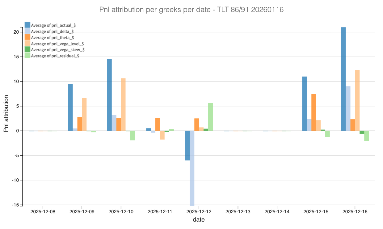 Delta, on the other hand, played a very minor role overall. Despite some intraday swings around the FOMC and the following session, TLT remained tightly anchored around the 88 strike. As a result, directional PnL oscillated but never threatened the position in a meaningful way. This highlights the importance of path dependency: the absence of trend mattered more than the absolute level of rates.