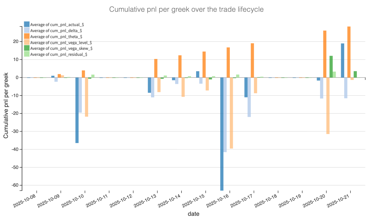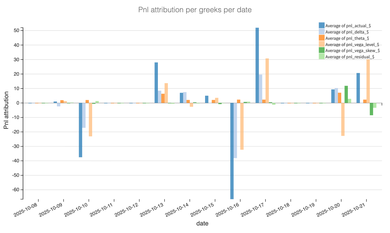 The snapback on 10/17 is the single best day and a classic “vol crush” bar where vega-level flips positive and recovers a big chunk of the drawdown.