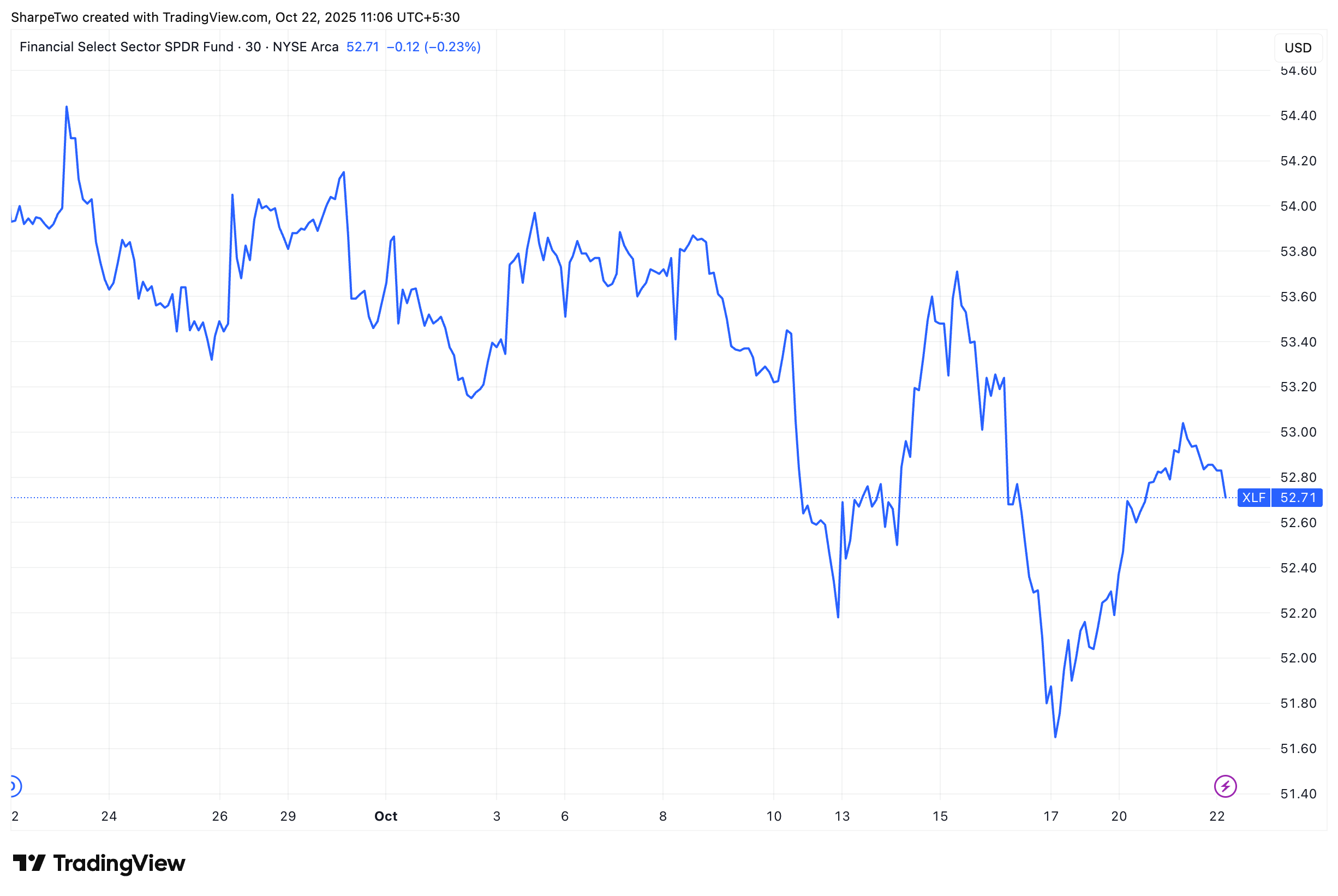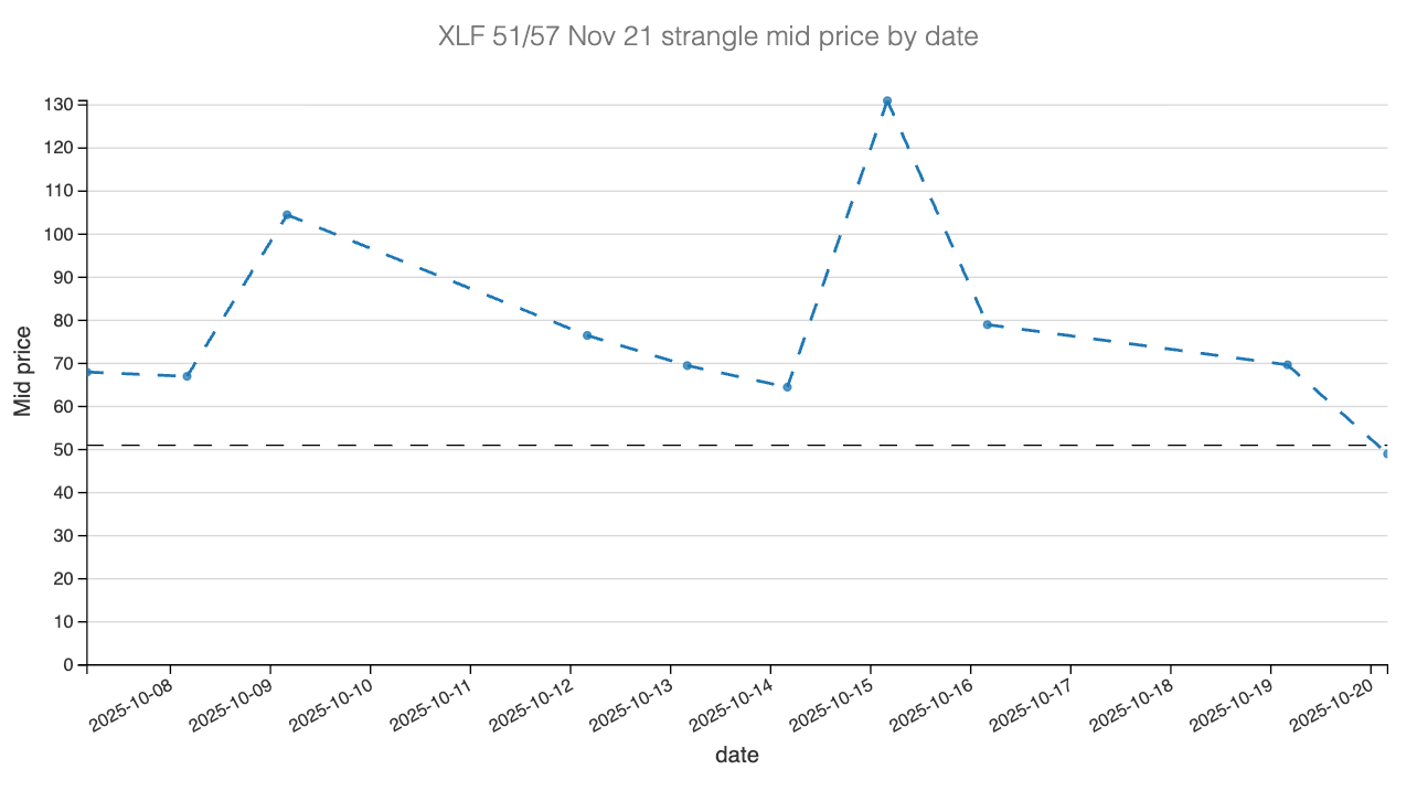 We entered the trade with XLF around 53.5. It dropped as much as 4% at one point, but then recovered and mostly traded within the boundaries of our strangle.