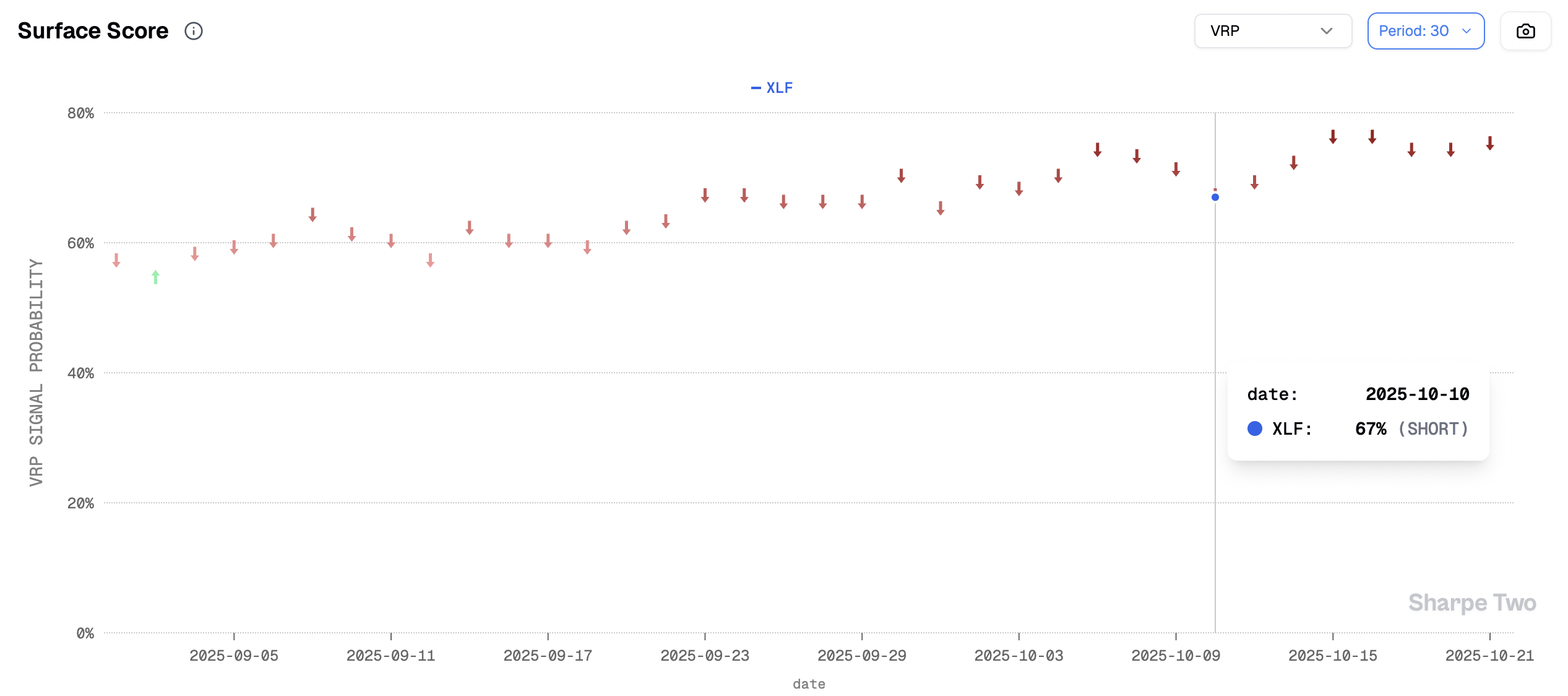 After the first blow on Friday the 10th, our signals still showed a 67% chance that implied volatility sold that day would exceed the subsequent realized volatility. That probability climbed back to around 75% for most of the following week.