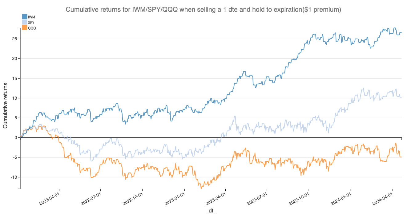 Before we start, let’s outline the conditions of our research. We only looked into SPY, IWM, QQQ, and the daily contracts when available. We simulate the sale of a straddle at mid-price on a 1 DTE at 3:50 pm right before the close and an exit at 3:50 pm right before expiration. We also assume that each position is normalized to $1 of credit.