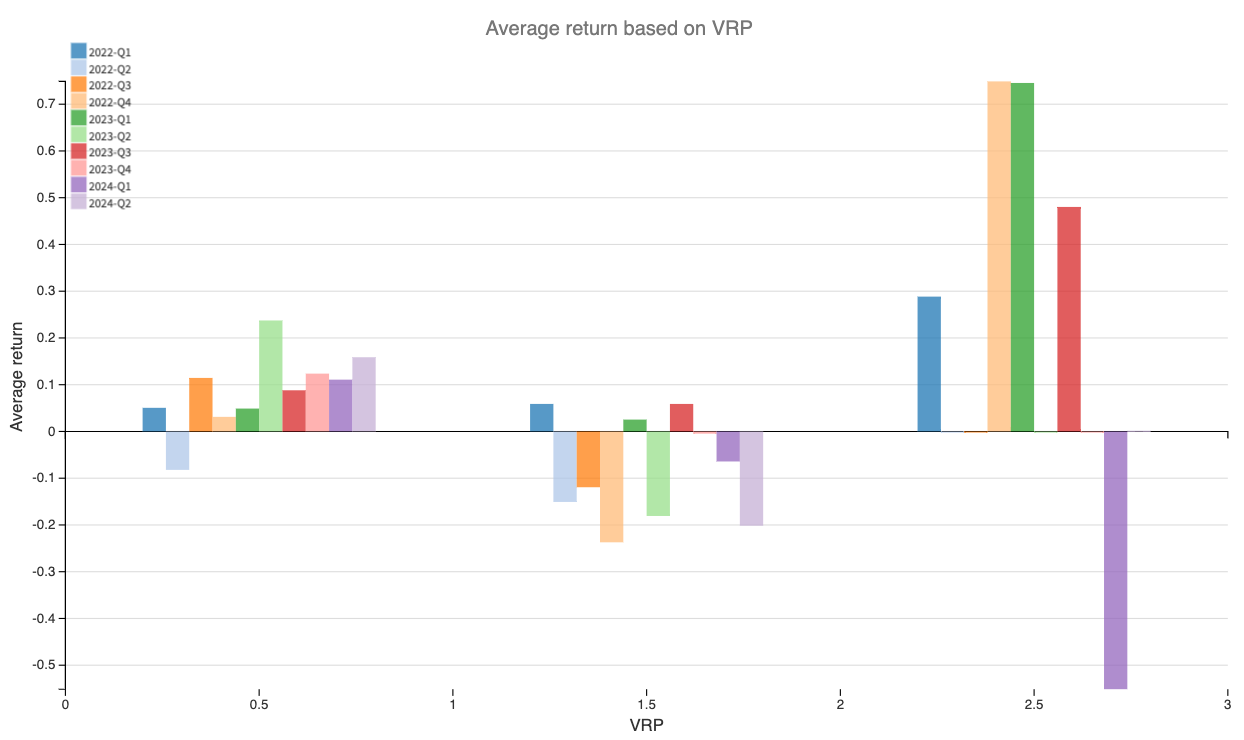 At this stage, it's important to note that our measure of the VRP, using an average of daily returns and making a ratio with the straddle price, is not perfect. However, it is still valid and avoids some serious complications.